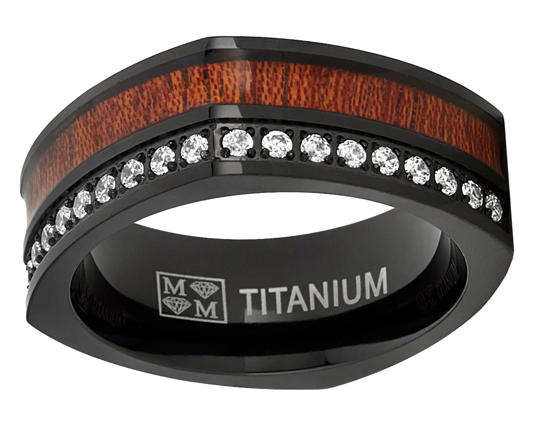 Step away from the traditional to this modern eternity titanium wedding ring. The ring features an 8mm square black band with read koa wood inlay and cubic zirconia.