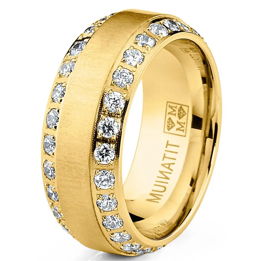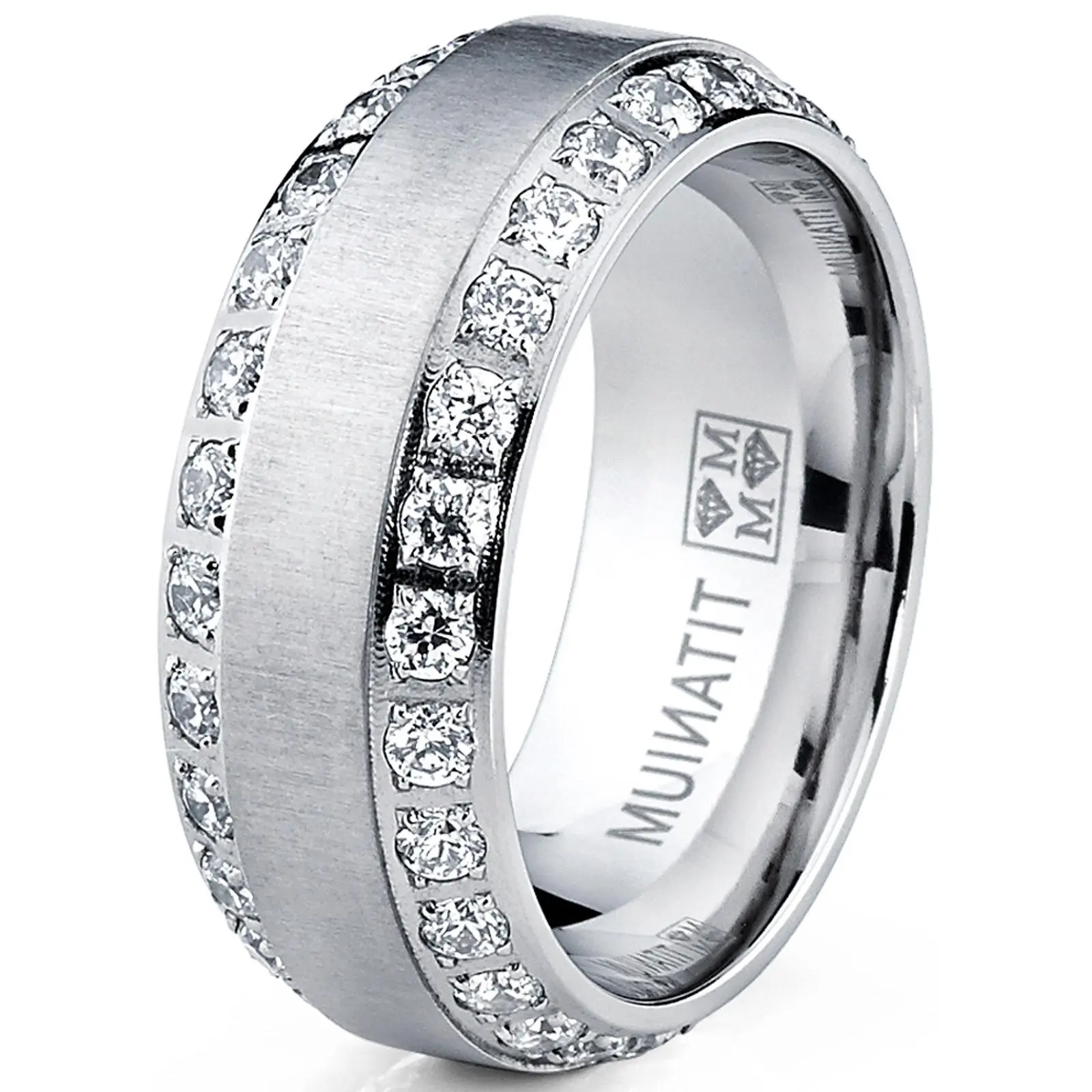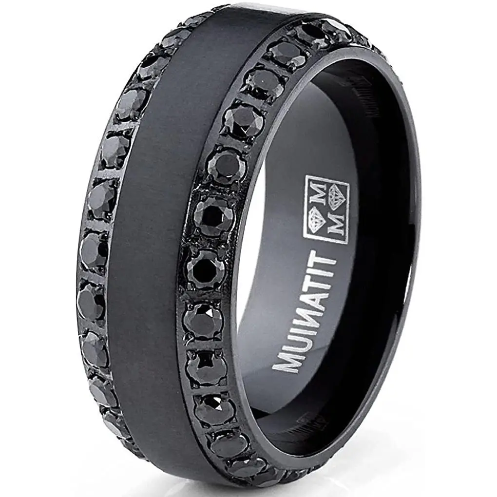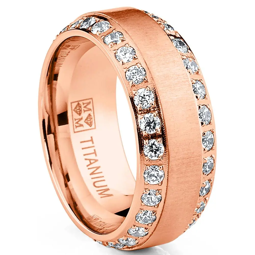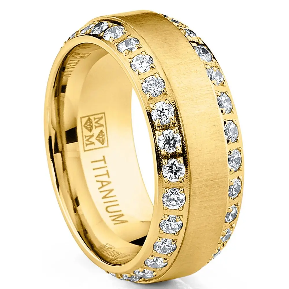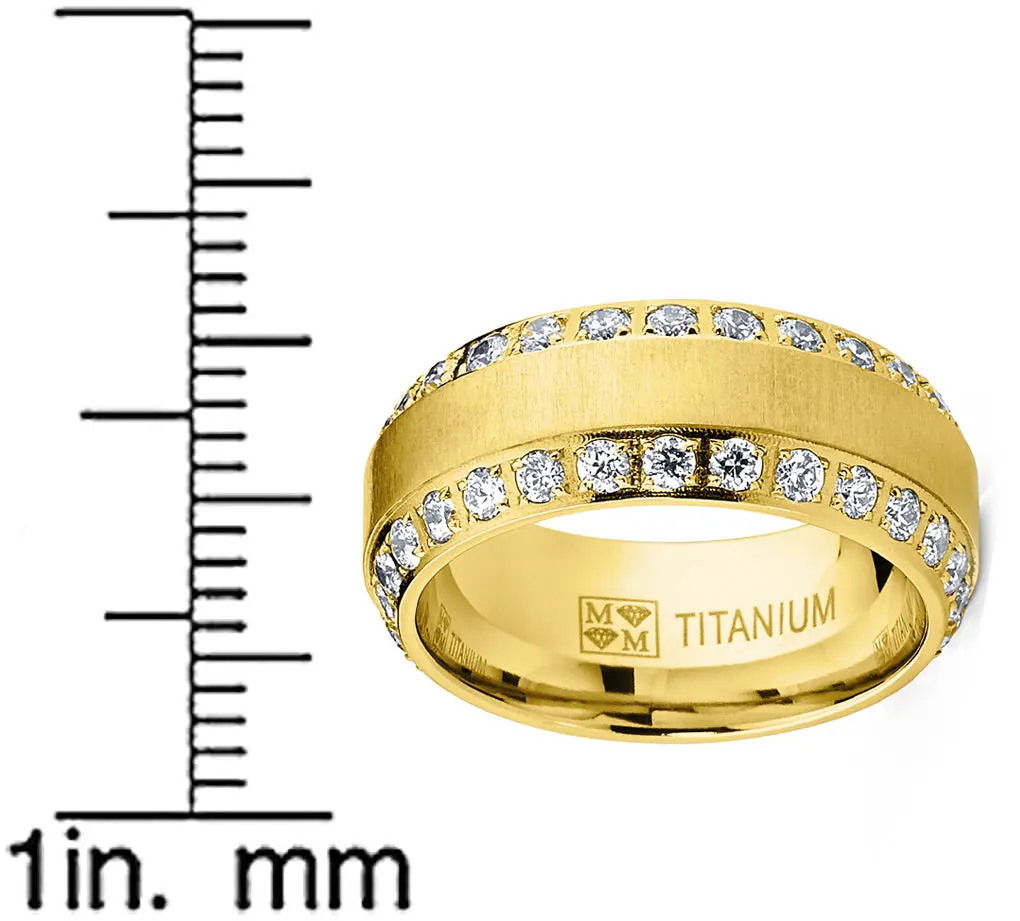 Shine bright on your special day with this solid Titanium dome wedding band ring for men. Featuring a brushed finish with two rows of glimmering Cubic Zirconia stones along the beveled edges for a luxurious look. Choose from various colors like Goldtone, Rosegold, Silvertone and classic Black.