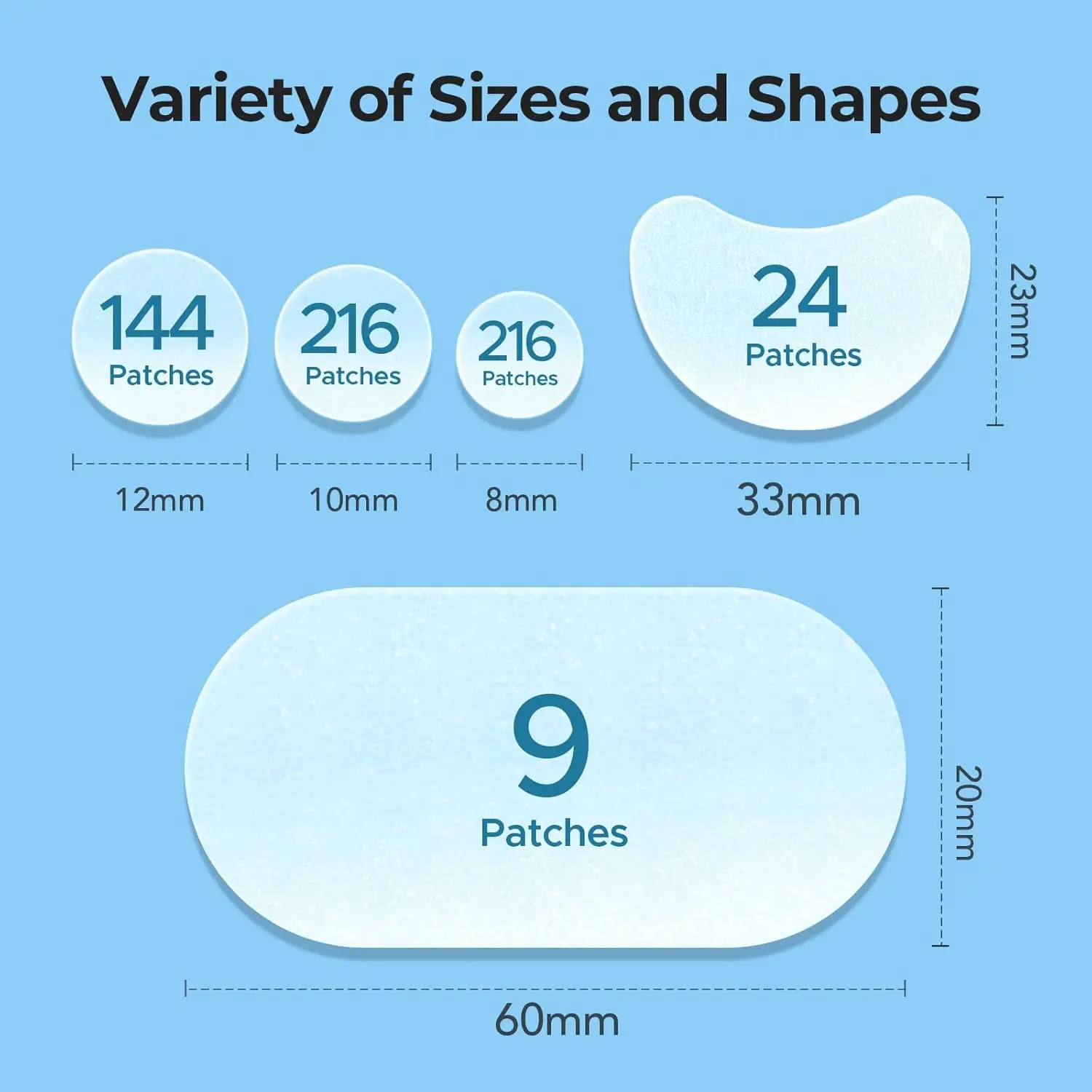 ·5 Sizes for Every Need: TKTK acne patches for face come in 5 different sizes - 8 mm, 10 mm, and 12 mm spot patches, 33x23 mm contoured patches, and 60x30 mm XL pimple strips. This variety ensures you have the perfect fit for all types of blemishes, providing precise coverage for any area of your face or body, whether it's your cheeks, forehead, chin, chest, or back