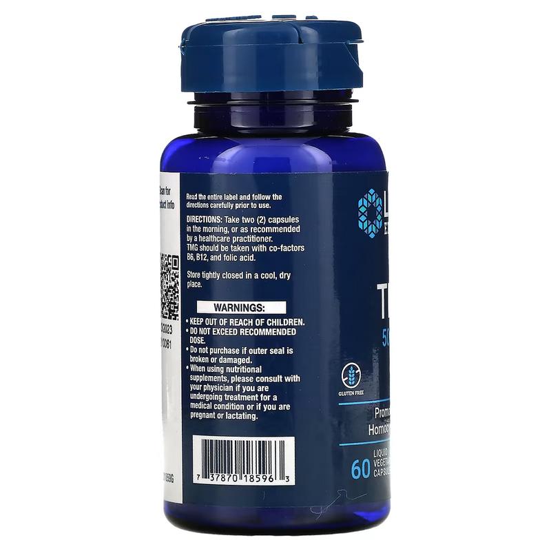 Each serving contains 1000 mg of TMG (as betaine anhydrous). The container holds 30 servings, with 2 liquid vegetarian capsules per serving.