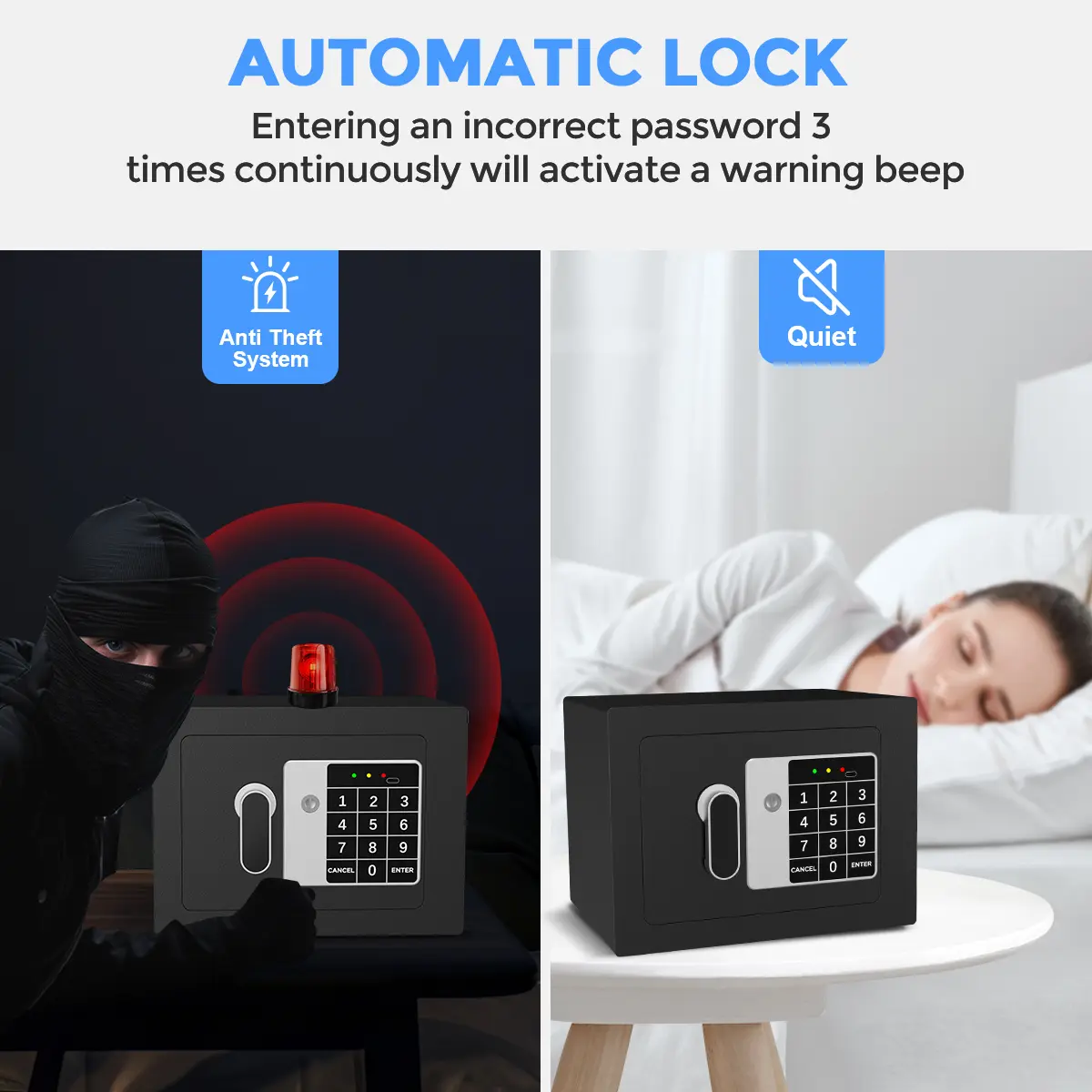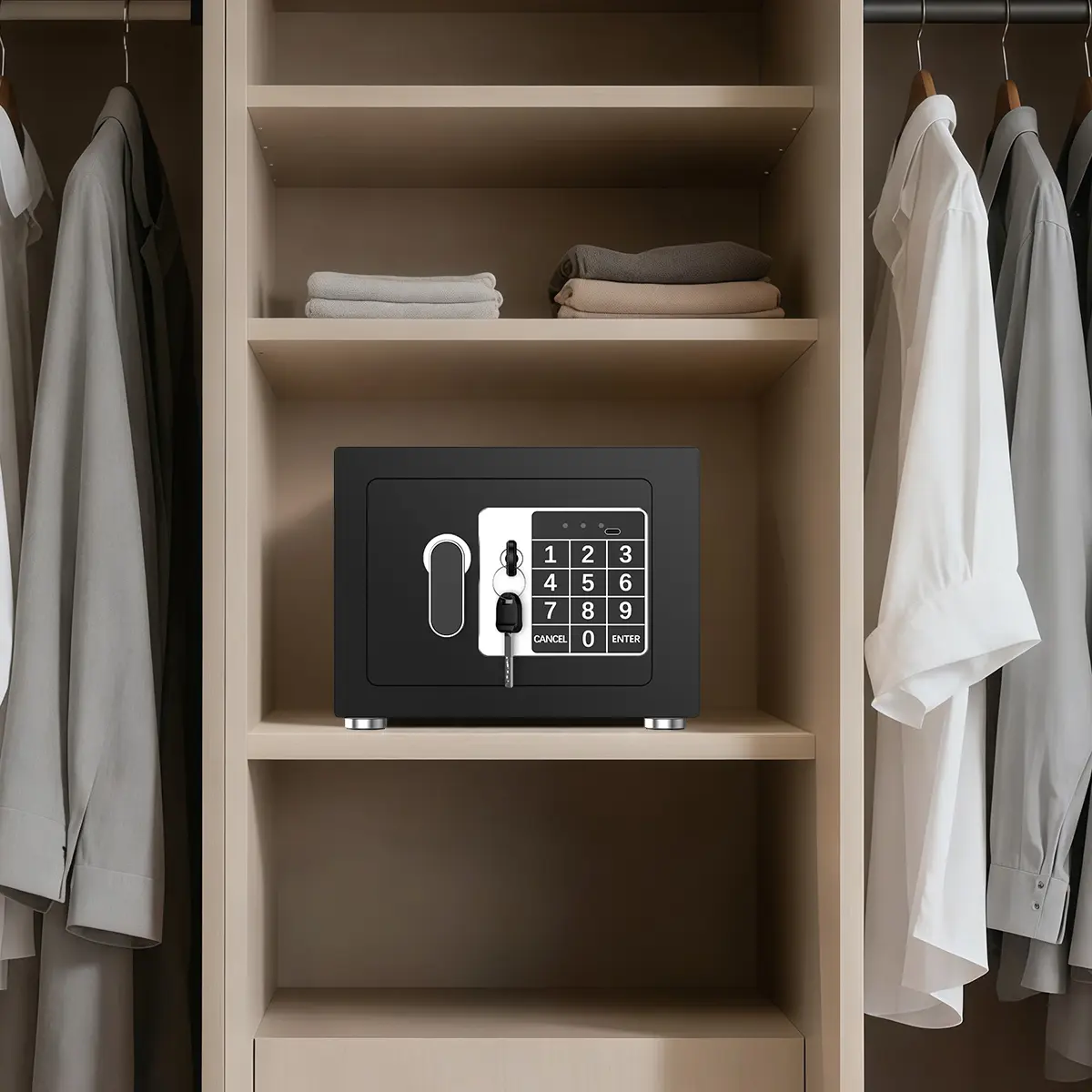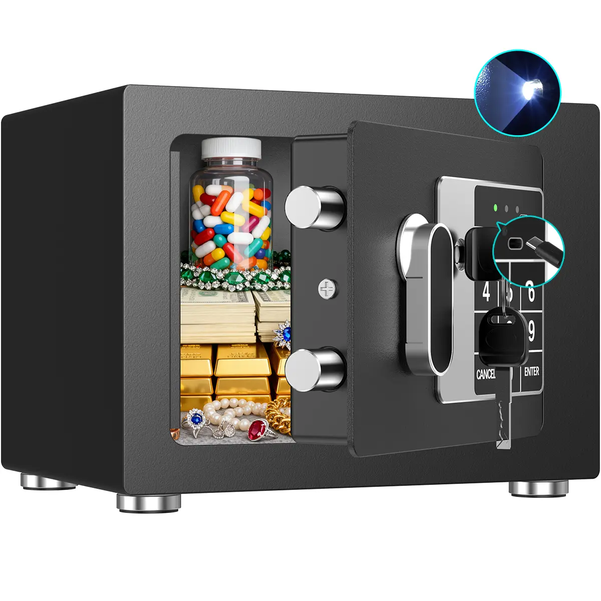 Intelligent Lighting Design:With batteries installed, when you open the safe box with password, the inner light will light up.