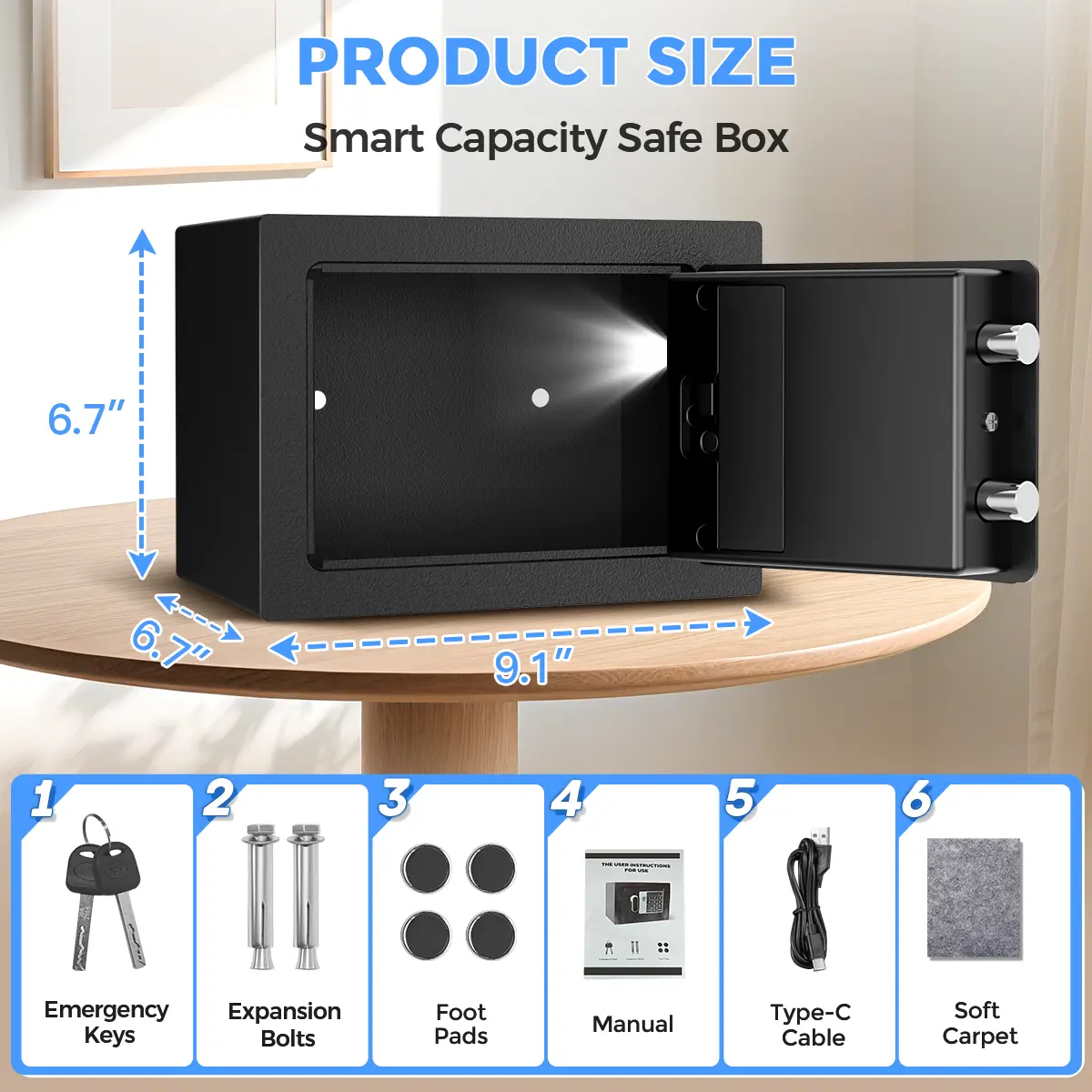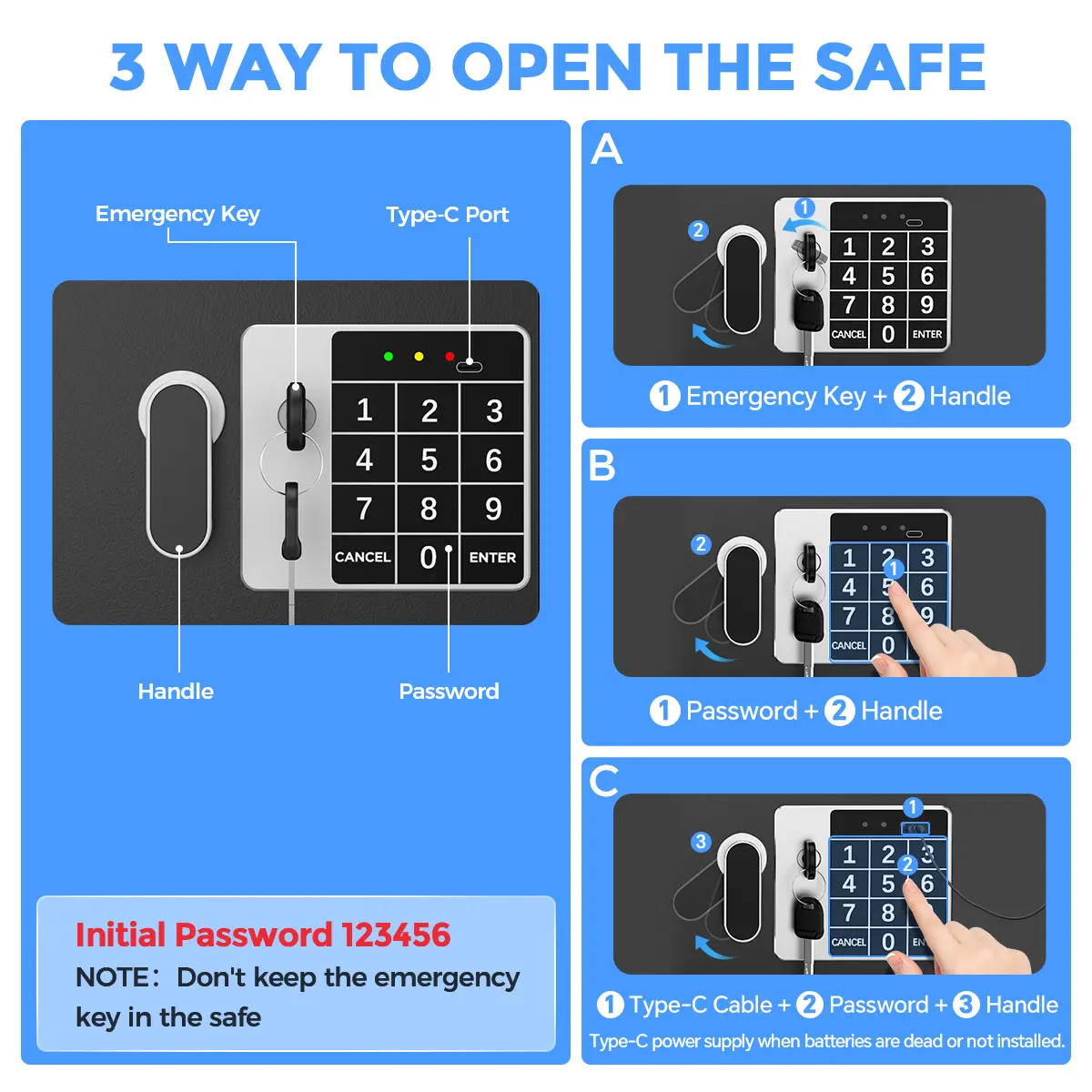 (NOTE: Don't put the emergency keys in the safe.Batteries are not included. The Type-C cable is for powering the safe directly, not for charging the batteries.)