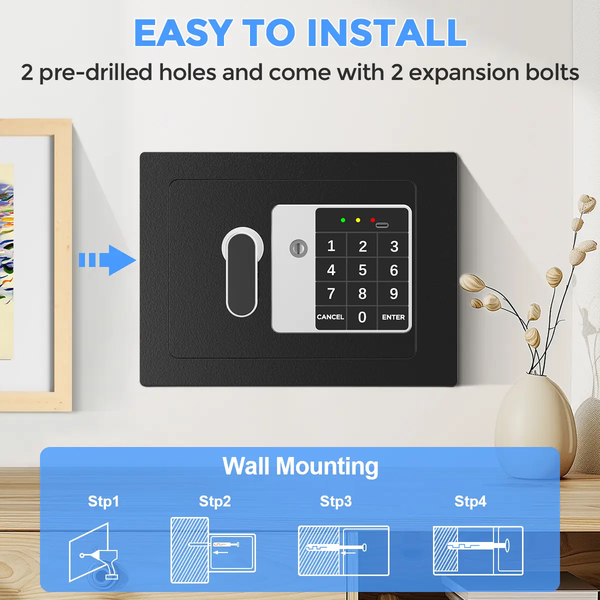 Easy Installation: This home safe box has a wall-mountable design, including 2 expansion bolts and 2 pre-drilled installation holes.