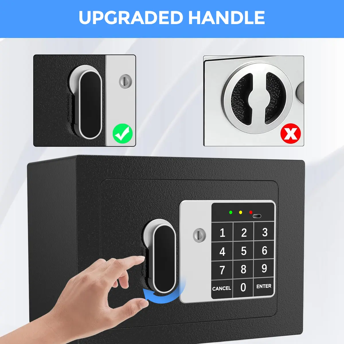① Emergency Key + Handle: turn the emergency key counterclockwise and turn the handle clockwise to unlock the safe box.