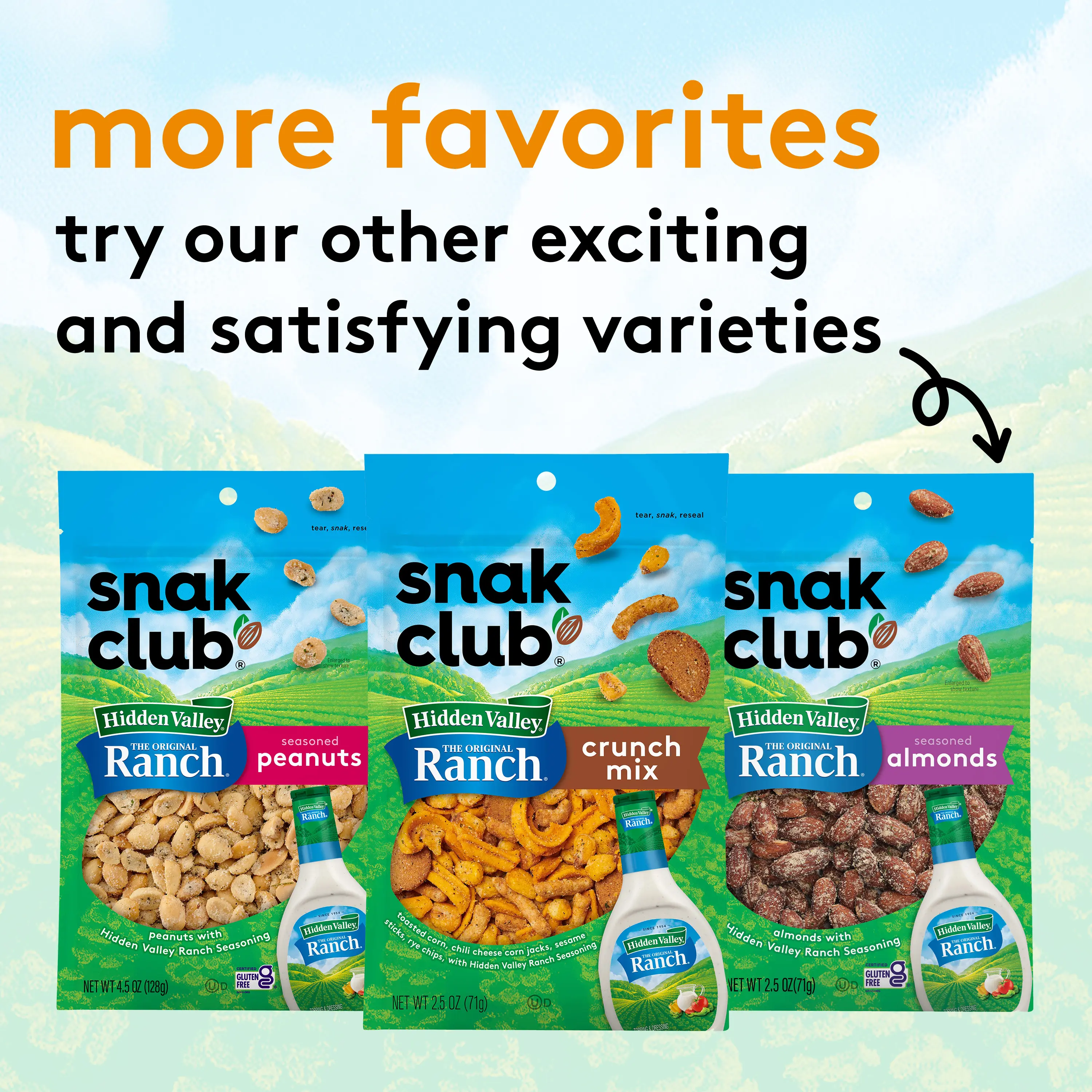 A resealable bag makes snacking and storing easy and helps keep your snack tasting great and fresh for longer. Additional snacks with Hidden Valley Ranch include peanuts, almonds, and a crunch mix.