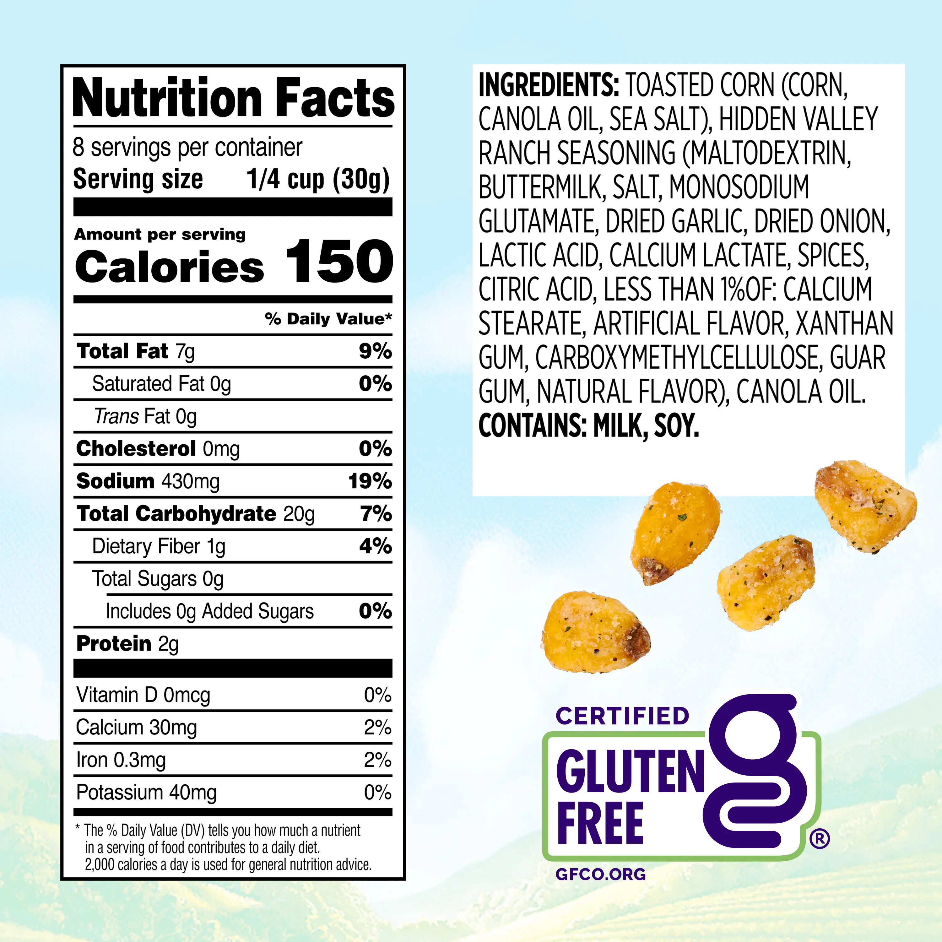IngredientsTOASTED CORN (CORN, CANOLA OIL, SEA SALT), HIDDEN VALLEY RANCH SEASONING (MALTODEXTRIN, BUTTERMILK, SALT, MONOSODIUM GLUTAMATE, DRIED GARLIC, DRIED ONION, LACTIC ACID, CALCIUM LACTATE, SPICES, CITRIC ACID, LESS THAN 1% OF: CALCIUM STEARATE, ARTIFICIAL FLAVOR, XANTHAN GUM, CARBOXYMETHYLCELLULOSE, GUAR GUM, NATURAL FLAVOR), CANOLA OIL.