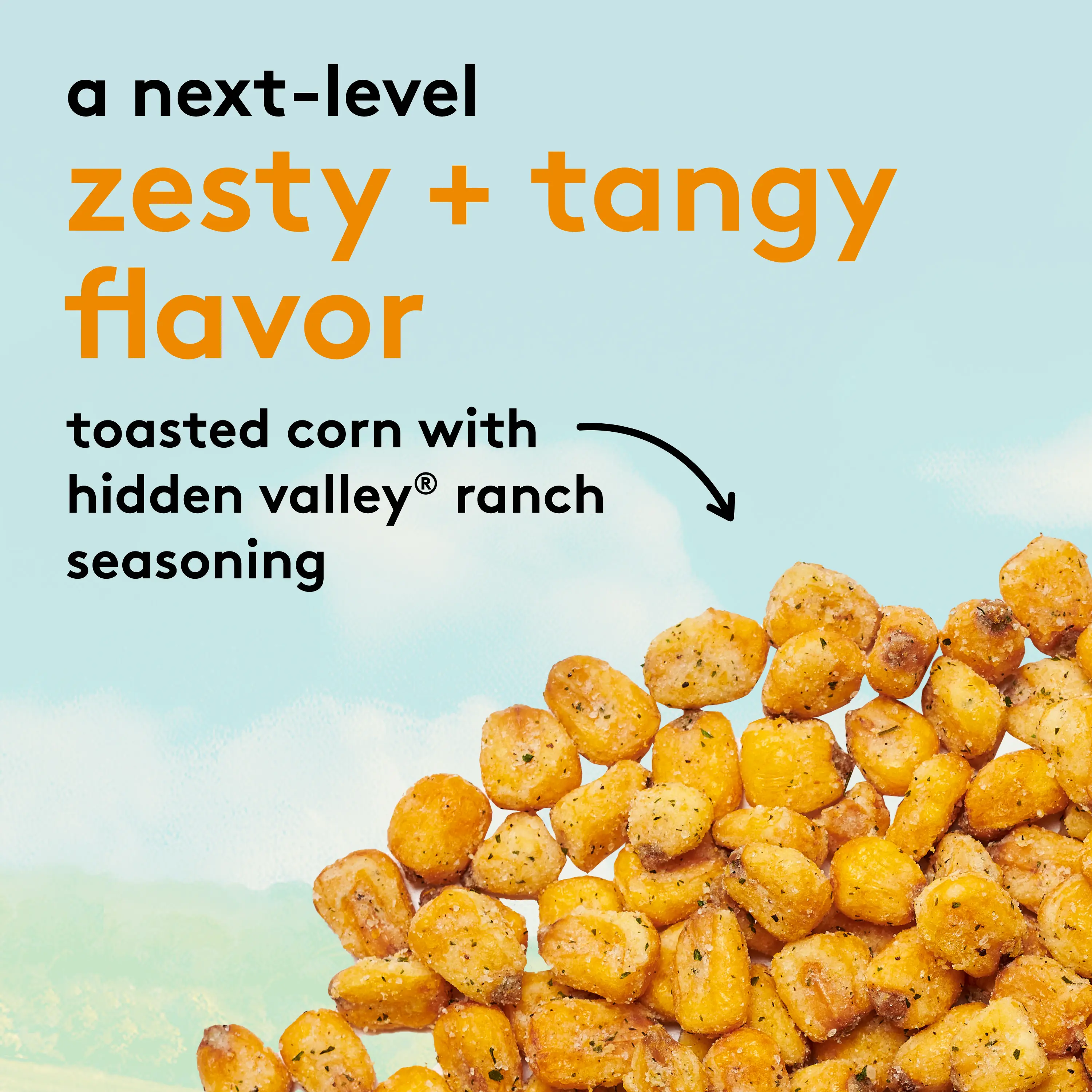 Our Snak Club Toasted Corn with Hidden Valley Ranch Seasoning brings next-level flavor with a combination of zesty, tangy, salty, and crunchy goodness. The crunch from roasted corn nuggets with the seasoning of Hidden Valley Ranch is the answer to your cravings.