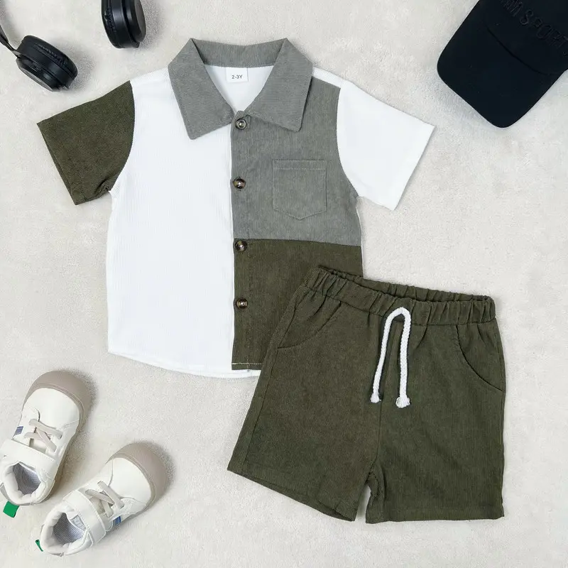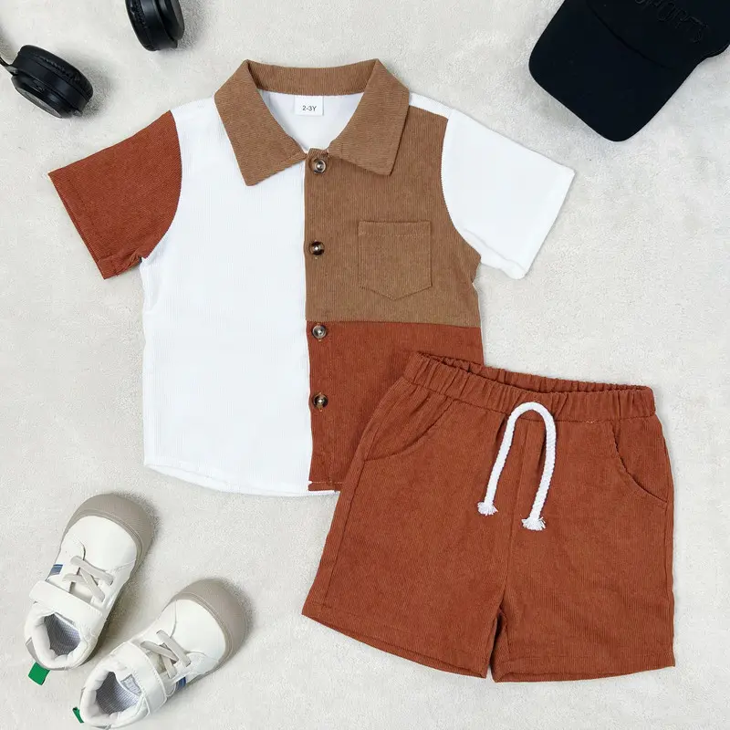 Design: color block,buttons,lapel collar,short sleeve top,match with shorts,simple yet fashion boy outfit