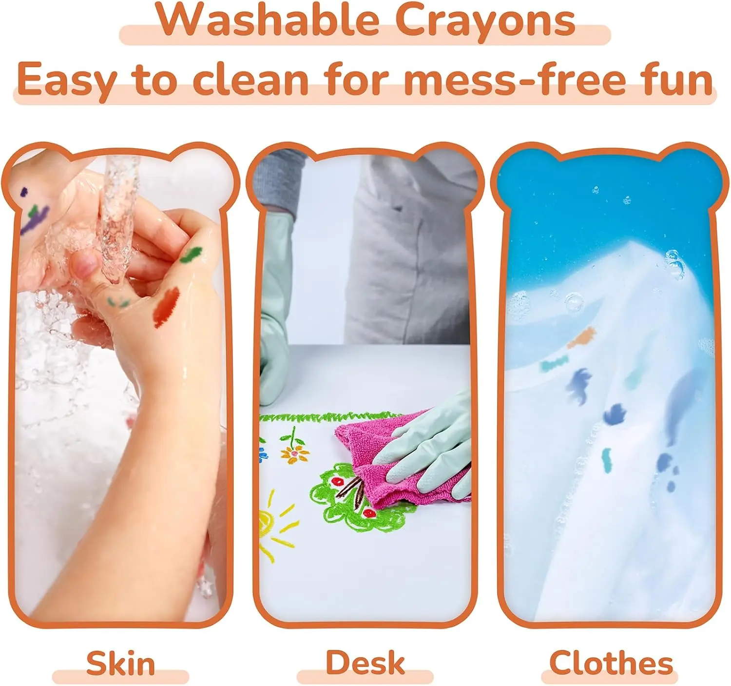 ·【Silky & Washable Crayons】Our crayons feature a silky smooth texture, they are not only easy to color, but also washable on various surfaces, such as skin, tables, clothes etc. Jumbo crayons make kids aged 1-12 enjoy a buttery-smooth coloring experience while parents doesn't have to worry about clean up.