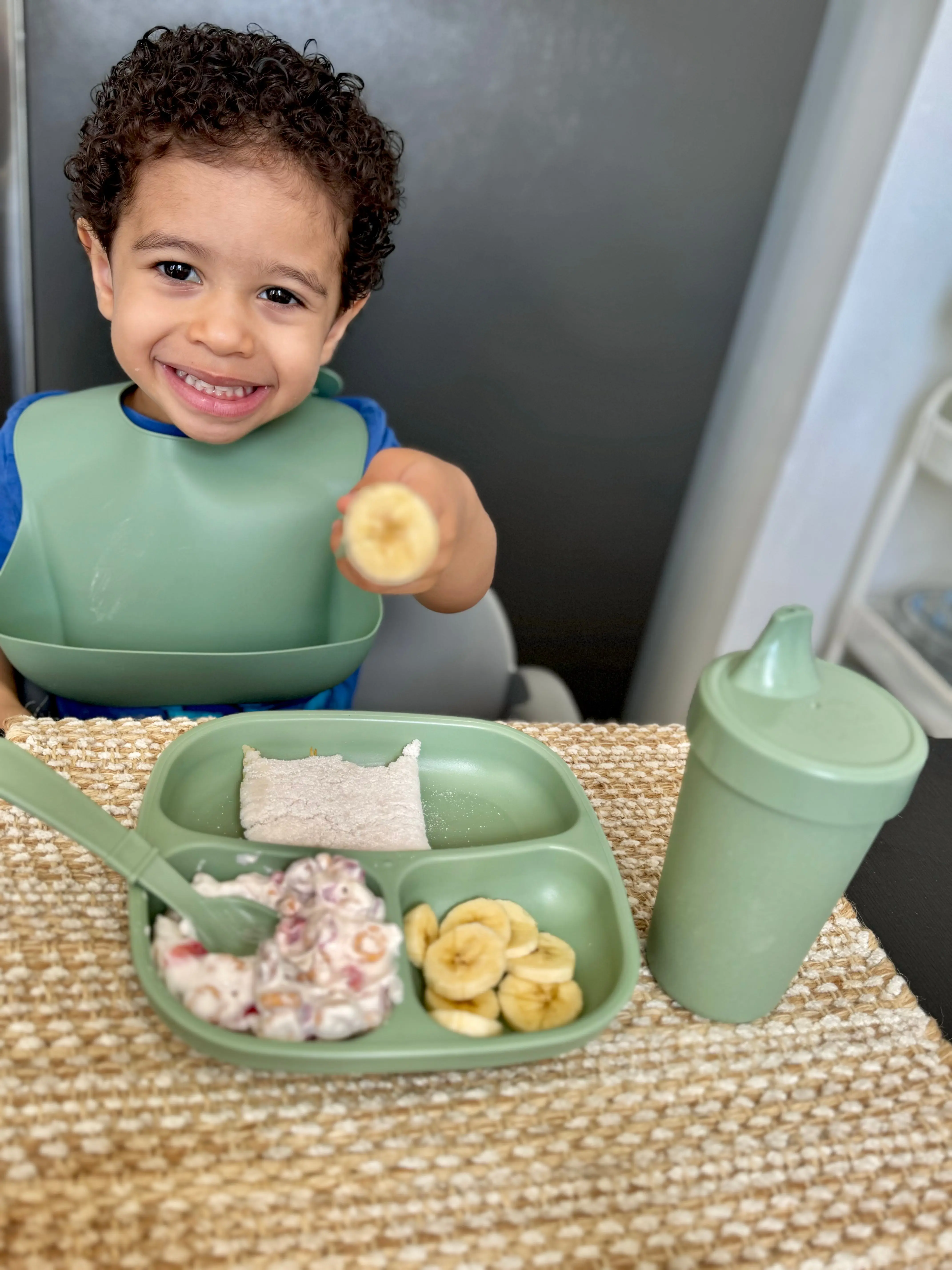Imagine a plate that keeps your carrots from canoodling with your chicken nuggets, a cup that laughs in the face of spills, and utensils that fit tiny hands like a glove. Plus, it's all made from recycled materials, so you're saving the planet while you munch!