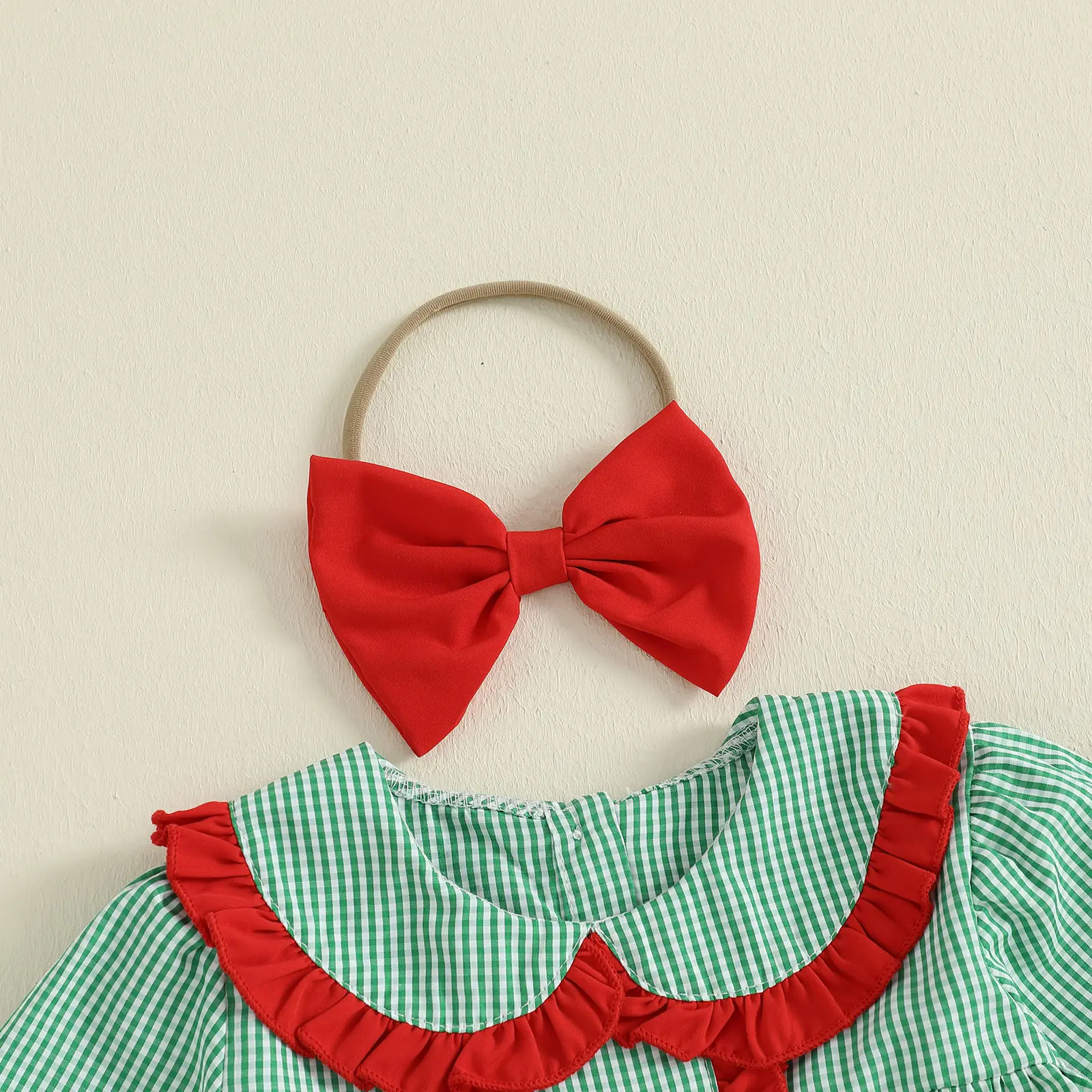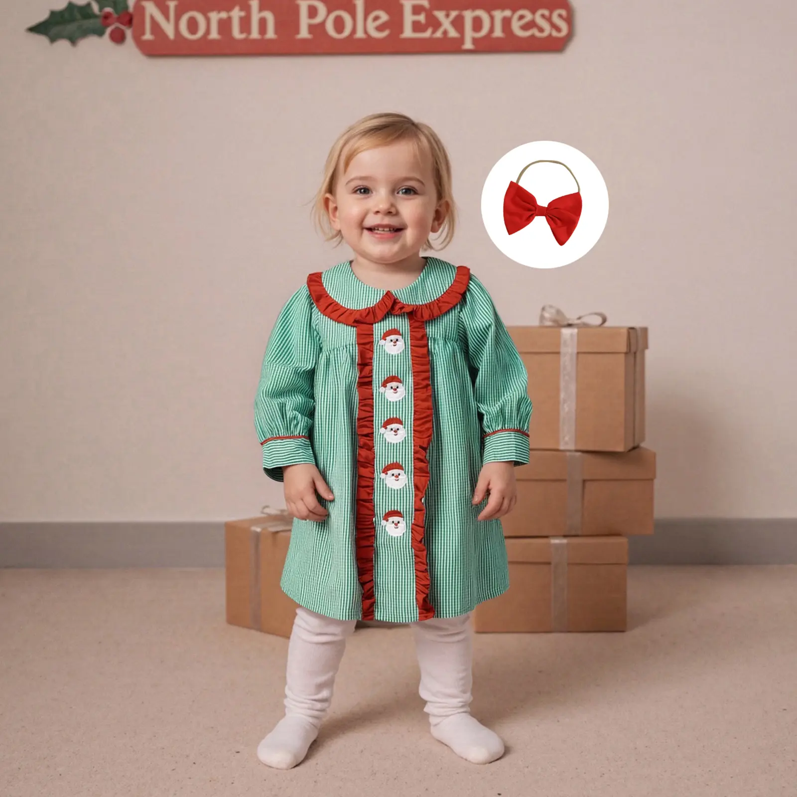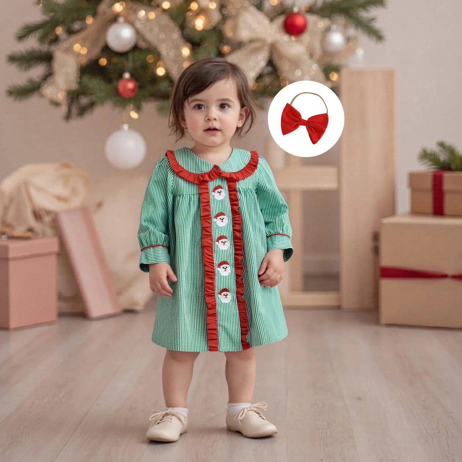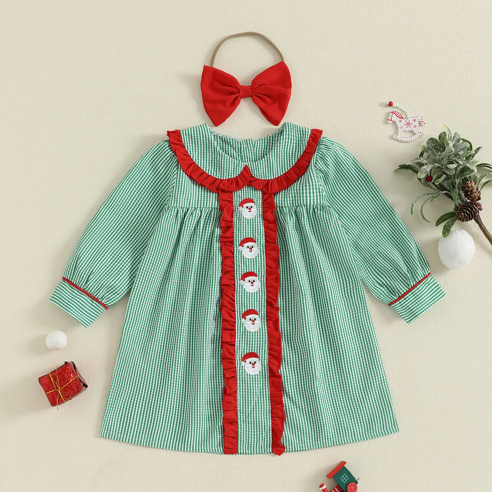 Toddler Baby Girls Plaid Dress Christmas Doll Collar Santa Claus Embroidery Long Sleeve Dress with Headband