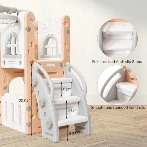 ·Multiple Fun Activities :Our toddler slide set is equipped with a variety of fun activities, such as a standalone slide, climbing ladder, basketball hoop, crawl tunnel, telescope, and steering wheel, and it can accommodate 2-3 kids playing at the same time.