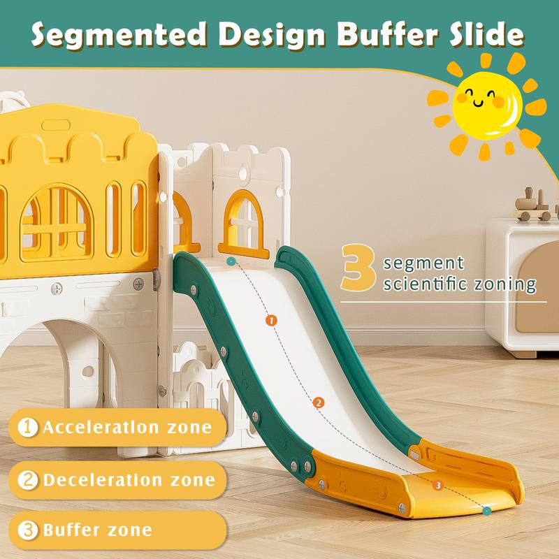 The Toddler Playground includes an arch-shaped opening at the bottom, designed for kids to pass through. This feature aids in developing their coordination between hands and feet.