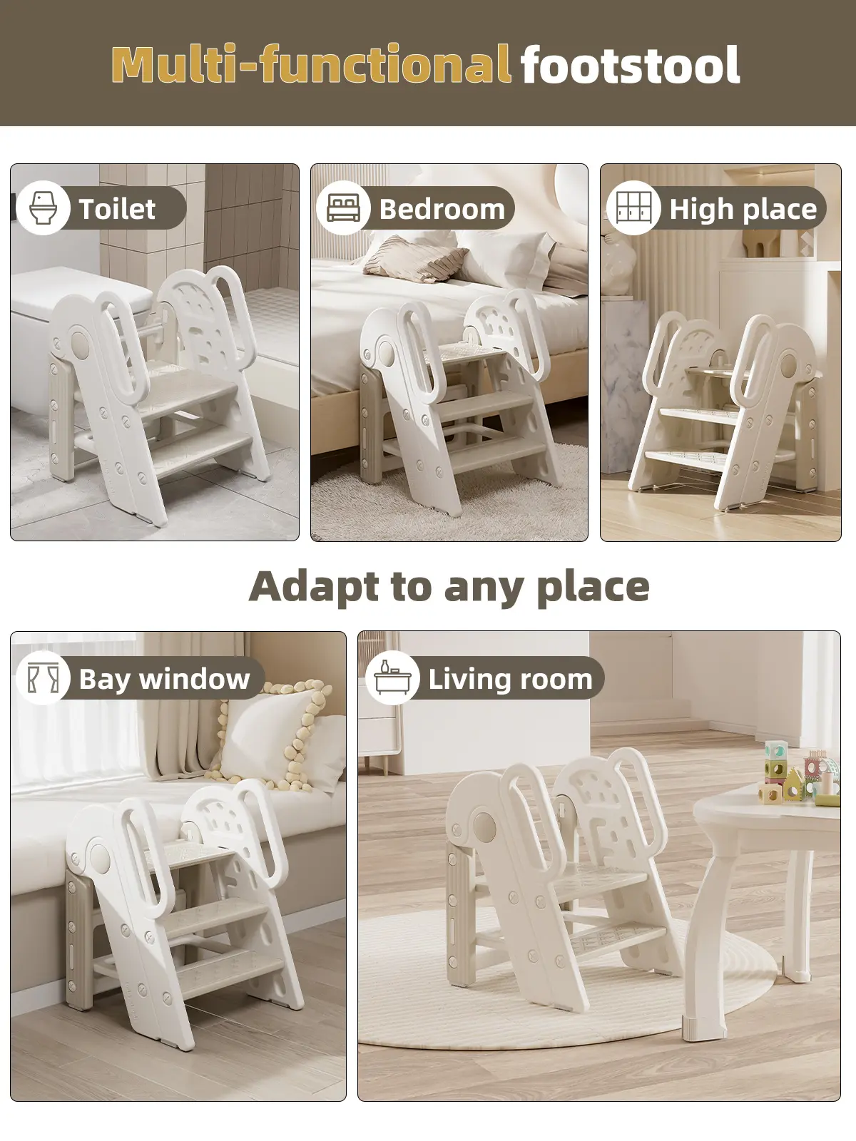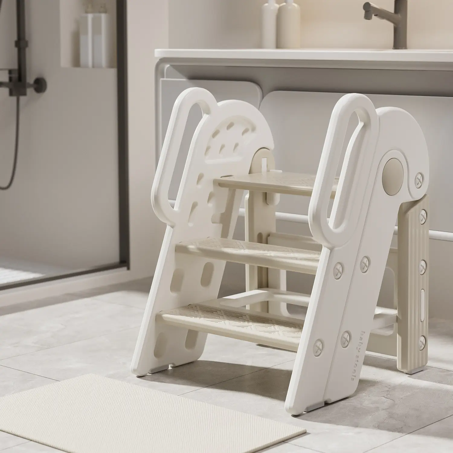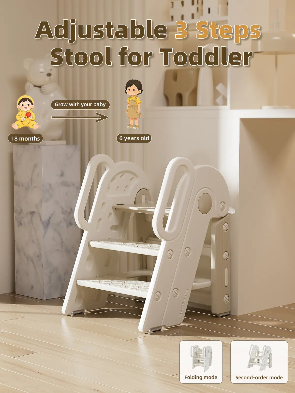 Toddler Step Stool for Bathroom Sink,Adjustable 3 Step Stop for Kids with Handles,Toilet Stool Potty Training,Foldable Step Stool for Bedroom Kitchen Counter,Plastic Ladder for Toddlers Beige
