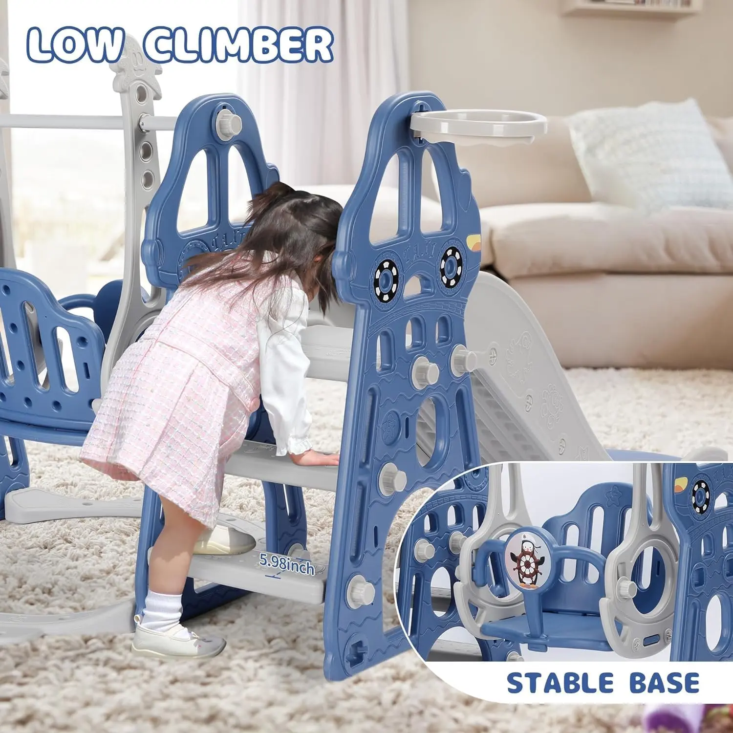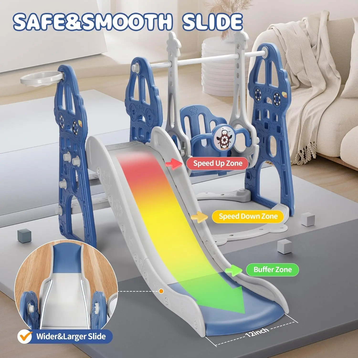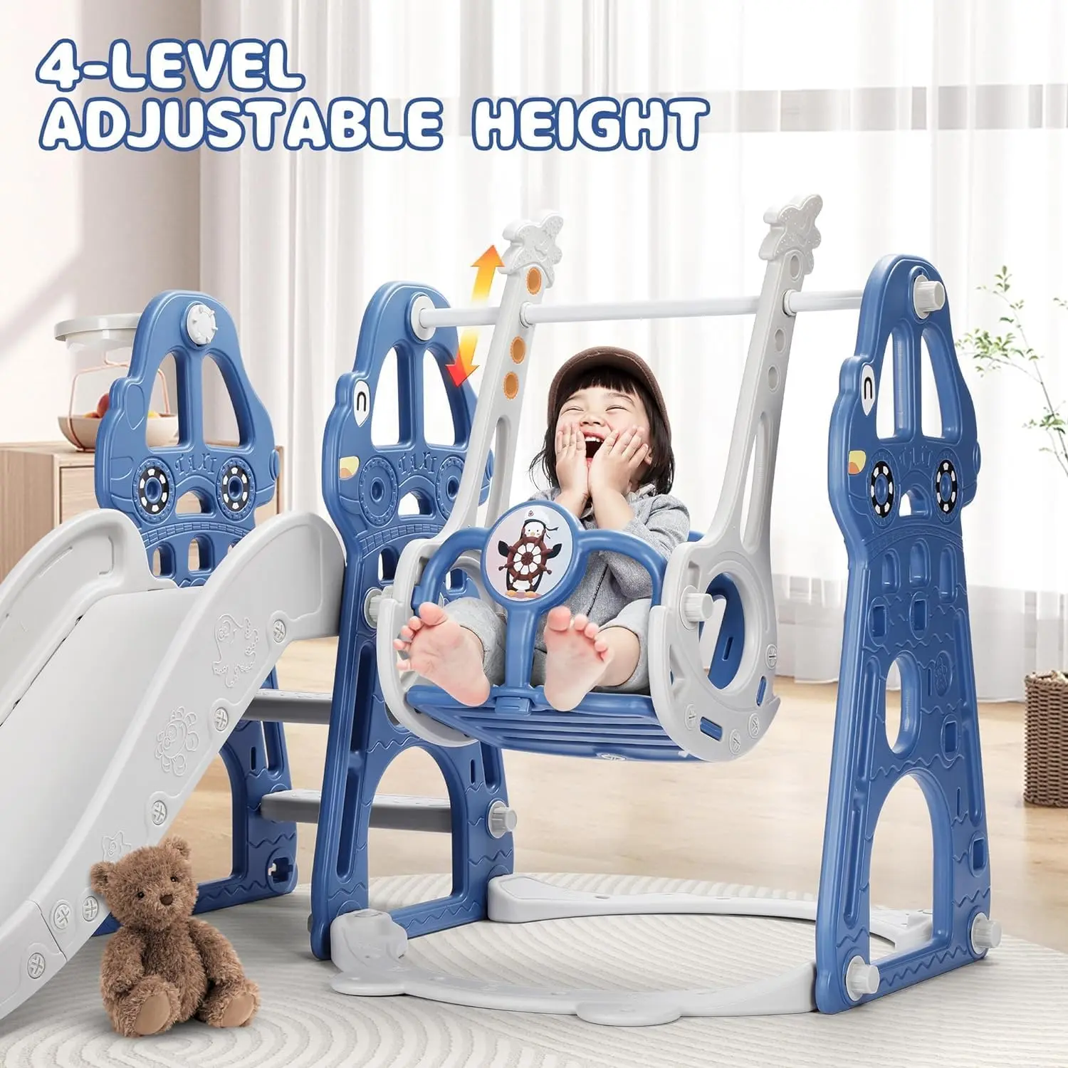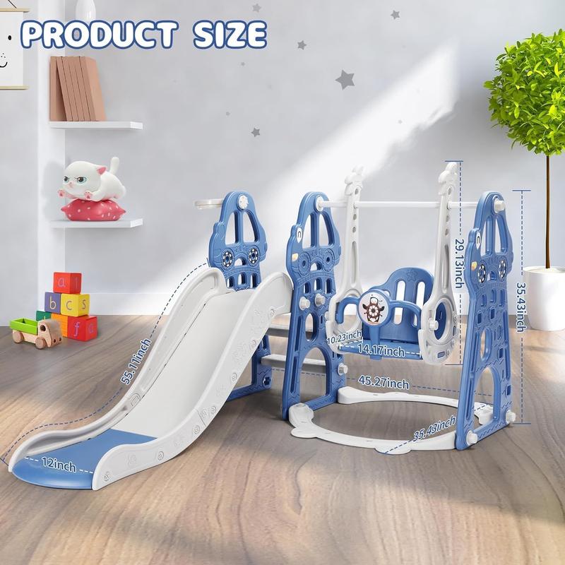 4 IN 1 DESIGN: This versatile playset combines a swing, slide, climber, and basketball hoop, providing your toddler with plenty of options for fun playtimes. It can hold up to 110 lbs, accommodating the weight of most toddlers.