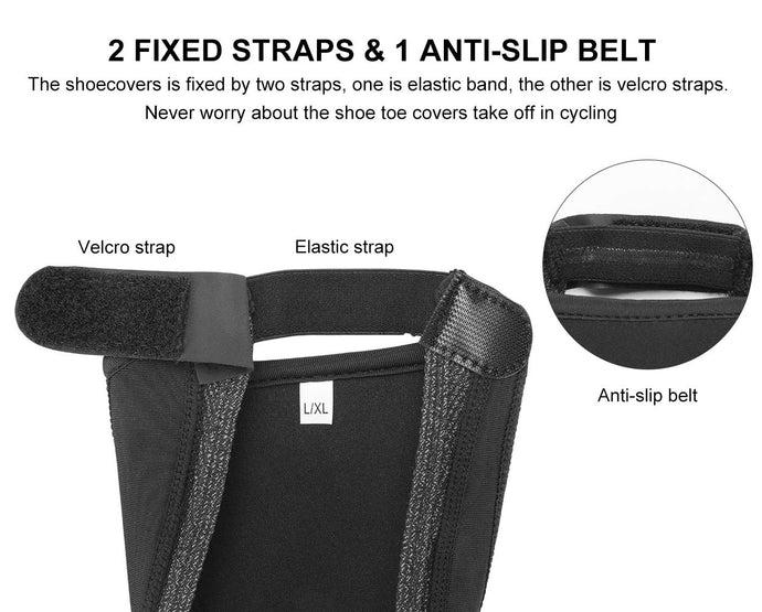 ·2 FIXED STRAPS: The shoecovers is fixed by two straps, one is elastic band, the other is straps. Never worry about the shoe toe covers take off in cycling