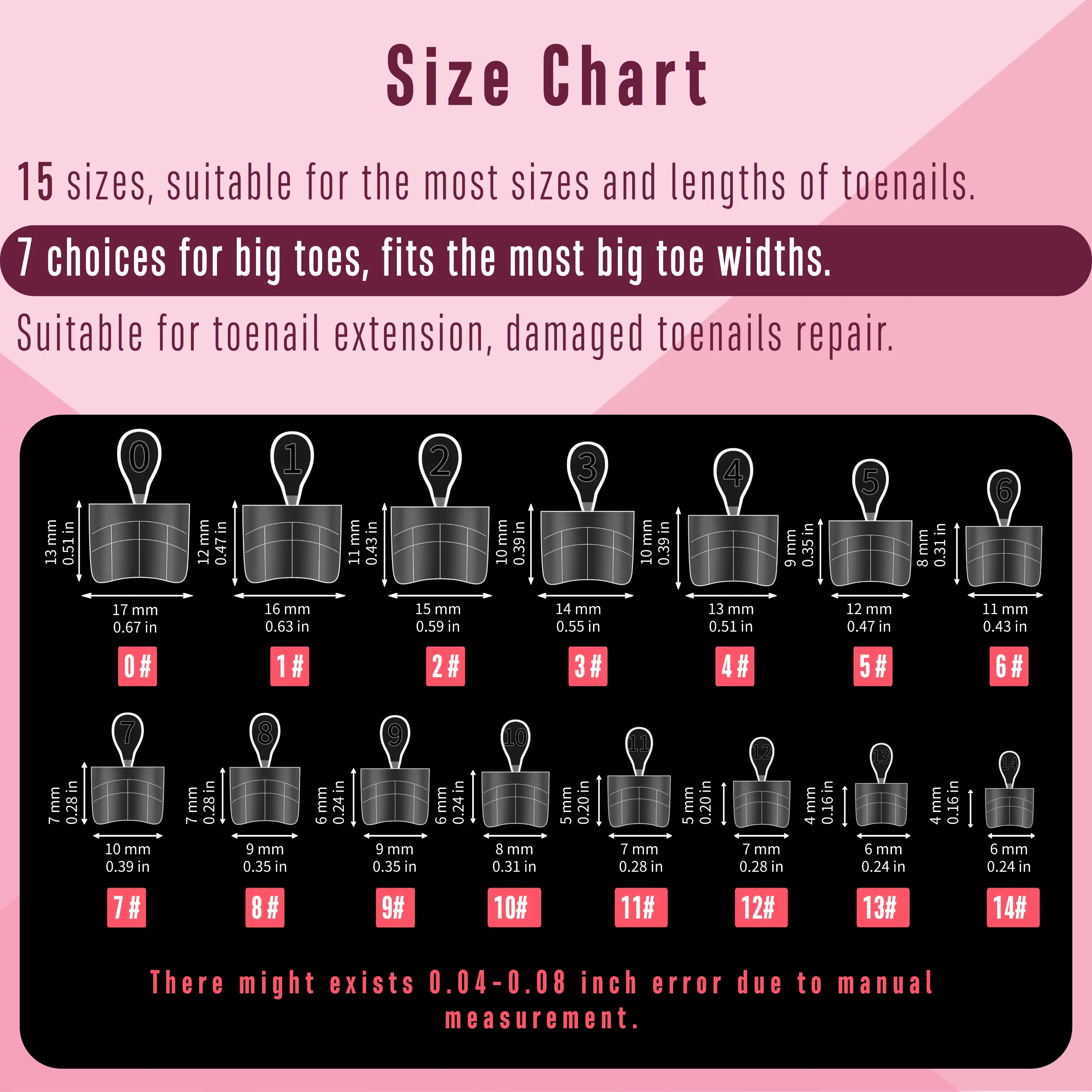 ·VARIOUS SIZE OPTIONS FOR THE BEST FIT: Our nail tips come in 15 unique sizes, including five options for the big toe, accommodating a wide range of toe sizes. Whether you have broad or petite nail beds, you’ll find the perfect fit among our tips. Enjoy the confidence of beautifully fitted nail tips that enhance your pedicure experience.
