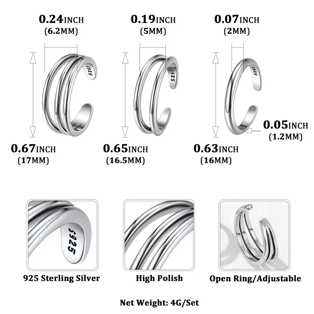 Different 3pcs in a set, minimalist and stylish,various styles meet your different needs. These simple sterling silver open band rings can be used as ideal toe rings,and are also popular to be used as finger pinky rings. These toe rings are delicate and eye-catching and give you more versatility and options.