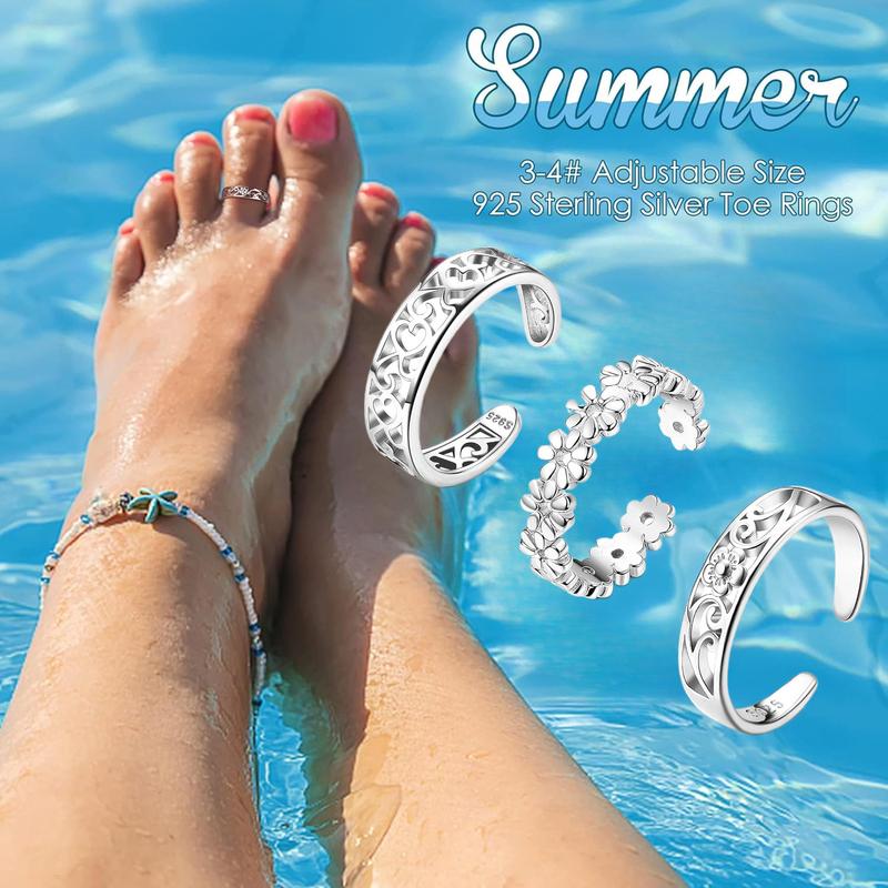 ·This set contains 3 PCS of different style adjustable toe rings. Three combinations are available. These sterling silver toe rings make you more charming at beach parties. The high-polished surface ensures a metallic luster and strong corrosion resistance. Hypoallergenic and comfortable, they won't hurt your toes or skin.