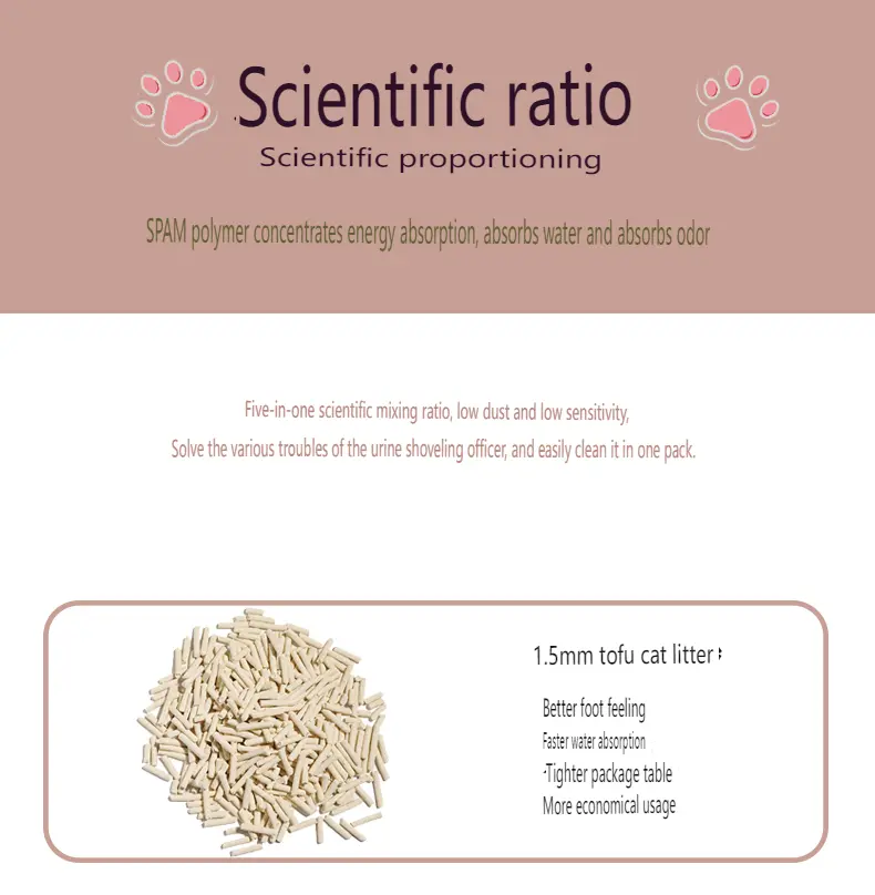 1. Made from Tofu Residue: Our Tofu Cat Litter is crafted from high-quality tofu residue, providing unique performance characteristics.