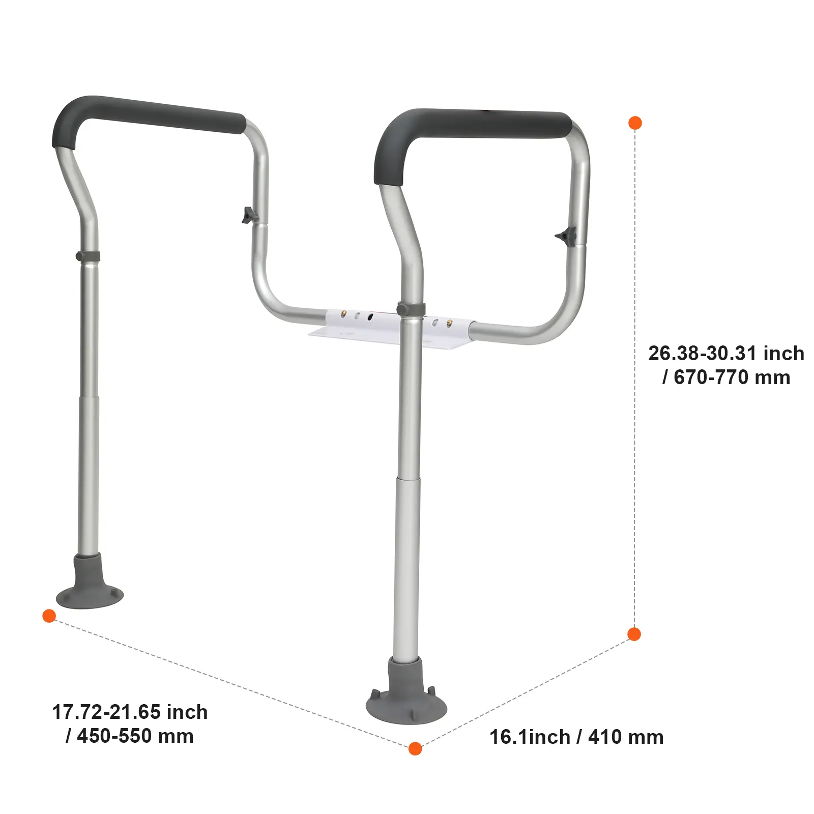 • Adjustable Width and Height: This toilet safety rail features a 3-hole adjustment for width (17.72-21.65 inches/450-550 mm) and 5-hole height adjustment (26.38-30.31 inches/670-770 mm), catering to most toilet sizes and accommodating users of various shapes and heights. Easy size switching with a button press ensures a comfortable fit for everyone.