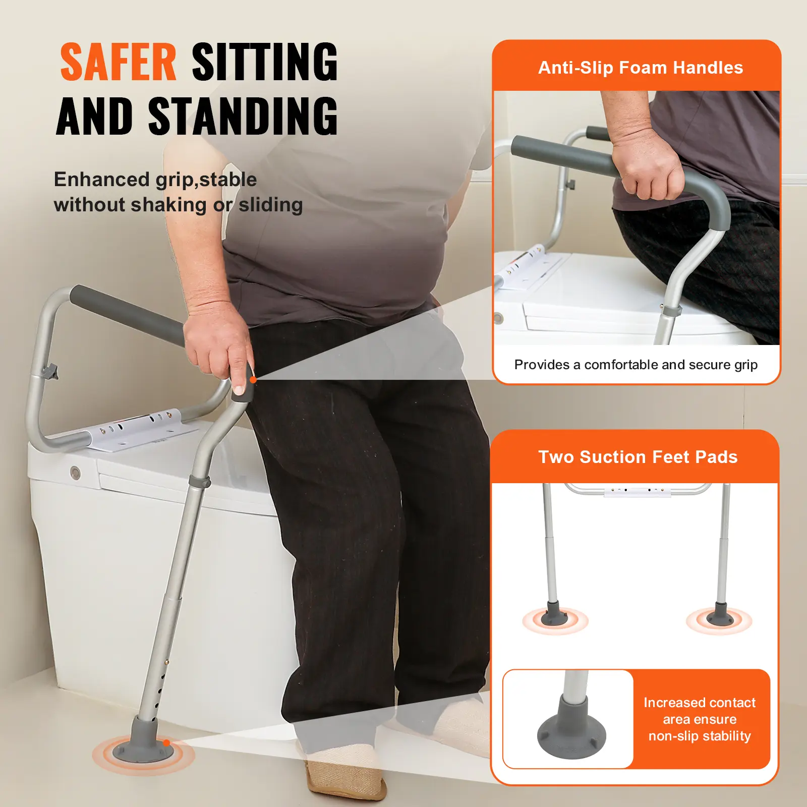 • Enhanced Stability and Grip: Our toilet safety rail for seniors is equipped with two suction cup feet for superior ground adaptability. The foam armrests of the toilet safety frame provide a secure, comfortable grip. Please note: for optimal suction, avoid placing the feet on uneven surfaces.