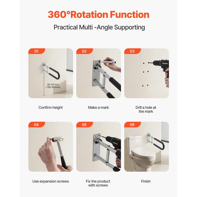 • Space Made Efficient: Our toilet grab bar offers 0°–90° rotation functionality. Simply adjust the tightness of the upper and lower screws to easily adjust the handrail angle. When not in use, the handrail can be set to a vertical position, saving valuable space, especially ideal for small bathrooms or other compact spaces