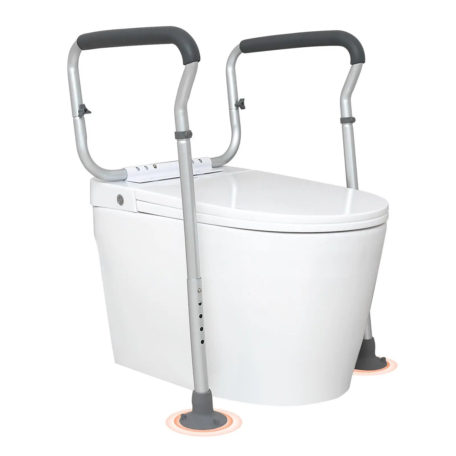 • Enhanced Stability and Grip: Our toilet safety rail for seniors is equipped with two suction cup feet for superior ground adaptability. The foam armrests of the toilet safety frame provide a secure, comfortable grip. Please note: for optimal suction, avoid placing the feet on uneven surfaces.