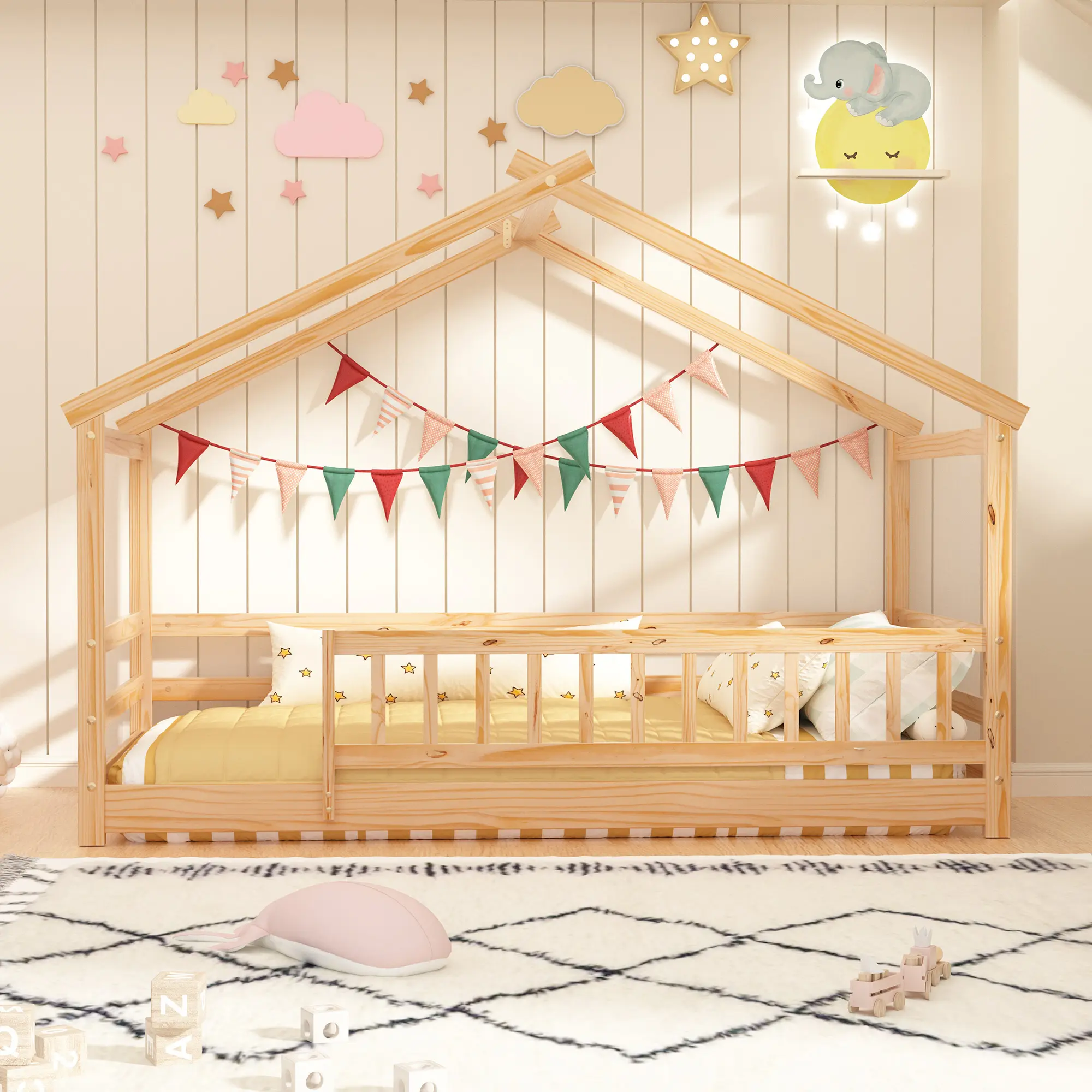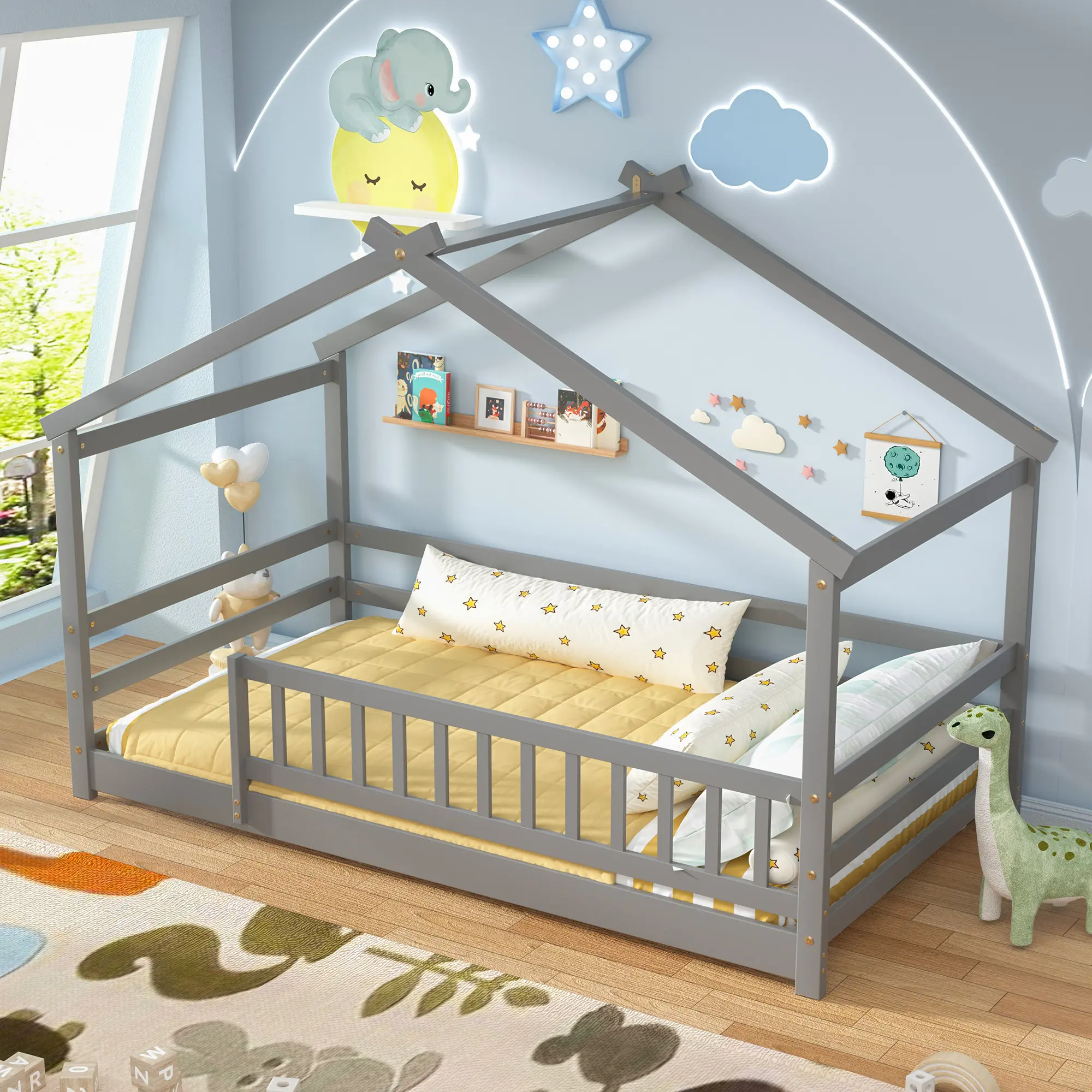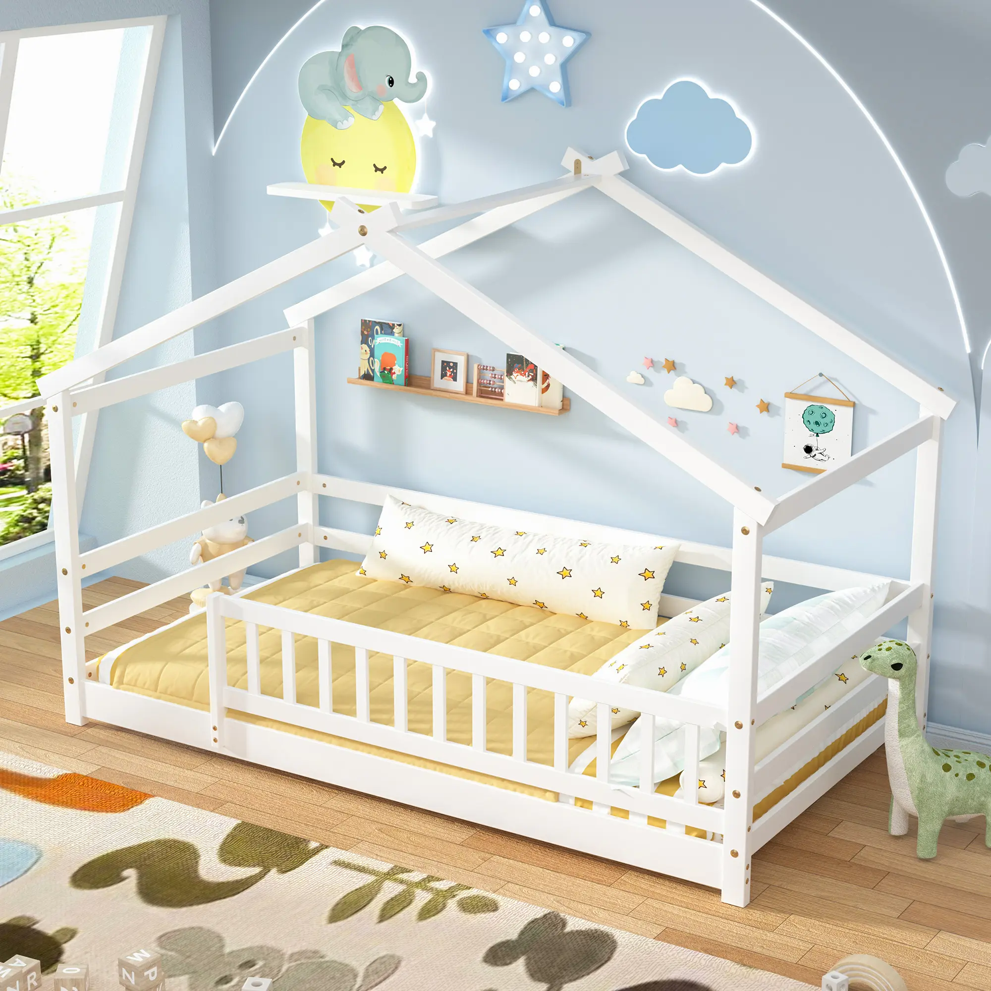 Let their creativity shine! The house roof is a blank canvas for customization—decorate it with colorful balloons, fairy lights, stuffed toys, or even their own artwork. Turn their bedroom into a personal play space that’s uniquely theirs. It’s not just a bed; it’s a creative outlet that sparks imagination!