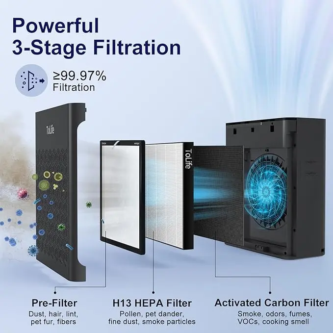 Clean air, fast. The ToLife K2 covers up to 1095 sq ft, removing smoke, dust, pollen, and pet dander with a high-efficiency H13 HEPA filter — breathe easier every day.