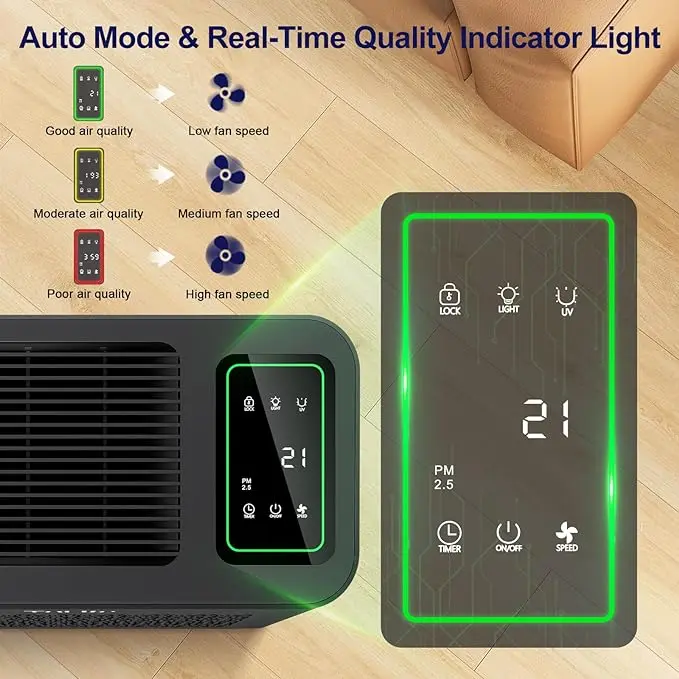 Your air tells you how it feels. The real-time indicator shifts from green to yellow to red, while the purifier automatically adjusts fan speed to match your room’s air quality.