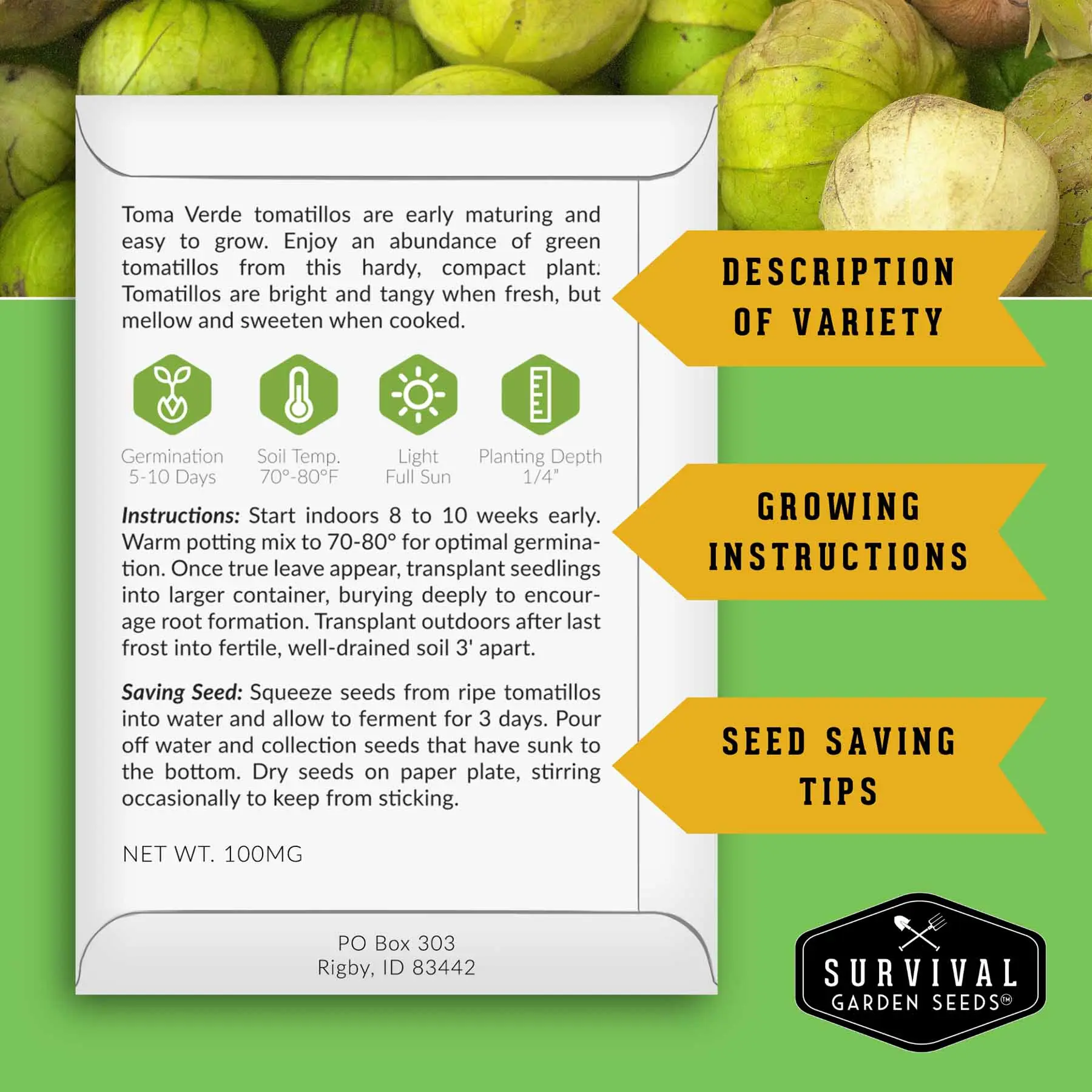 ·Early Maturing - Toma Verde is a prolific tomatillo, producing early yields and adapting well to a variety of conditions.