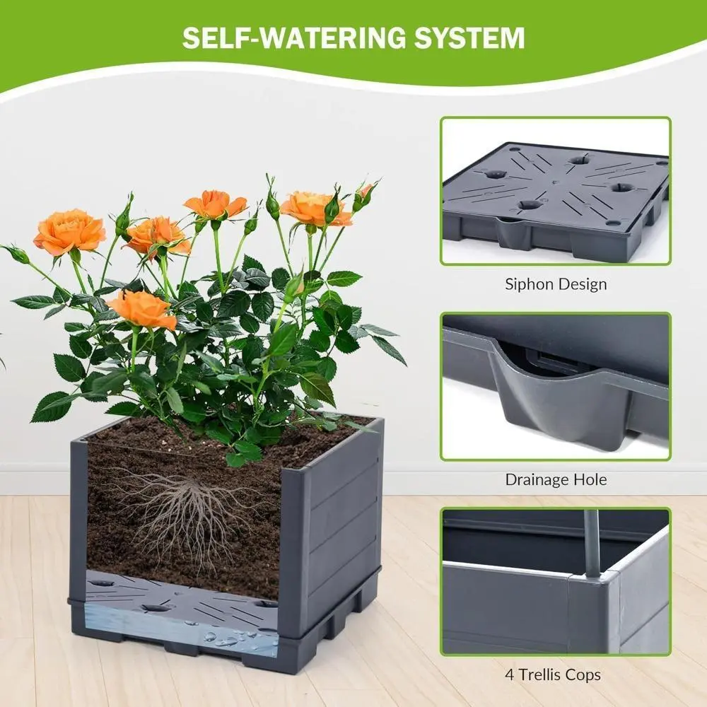 【Self-Watering Reservoir System】: Gardening just got smarter with our self-watering tomato planter. The raised garden bed comes with an innovative reservoir system that automatically absorbs and irrigates your plants for several days, ensuring they receive the perfect amount of hydration. The inclusion of 4 drainage holes prevents overwatering and root rot, keeping your plants healthy and vibrant