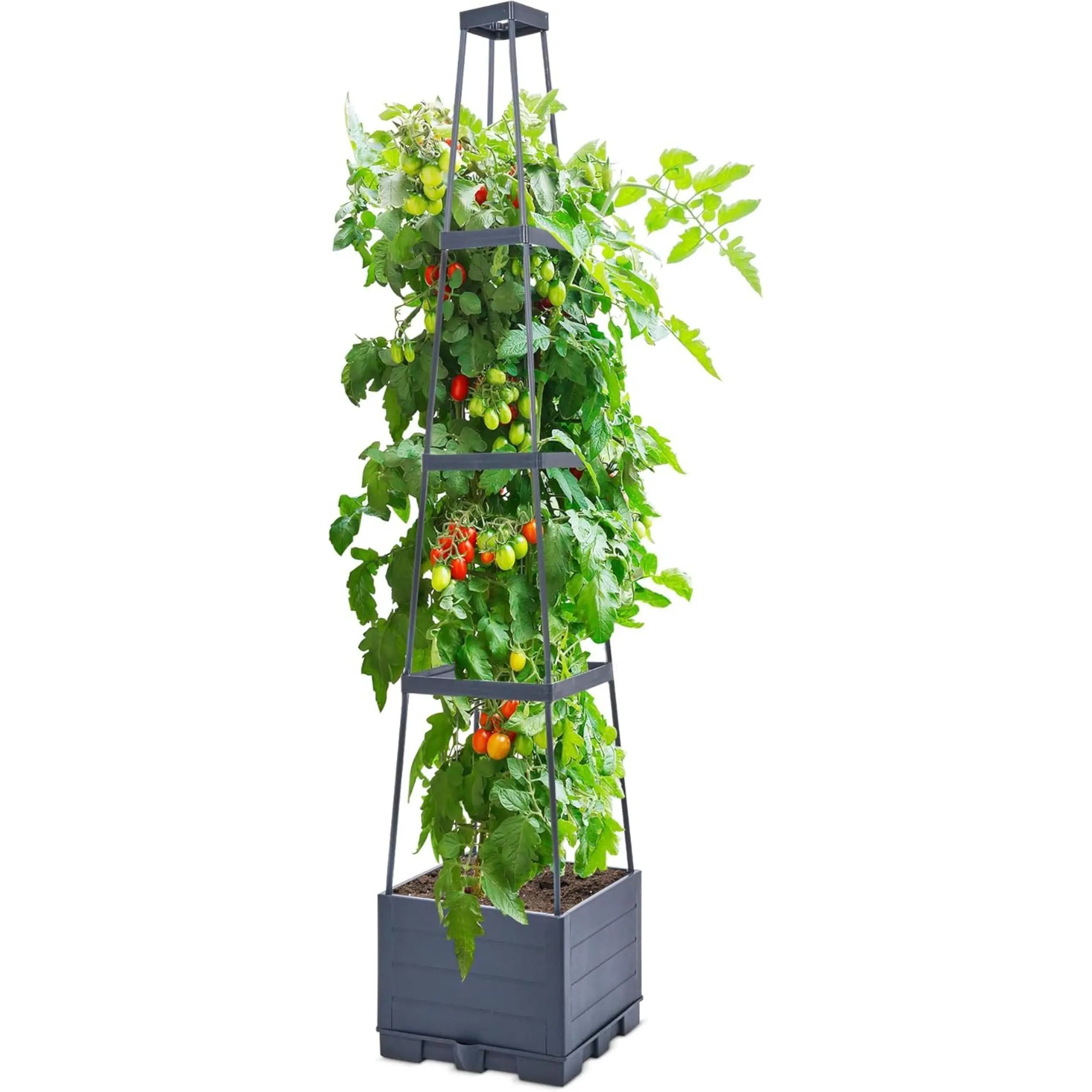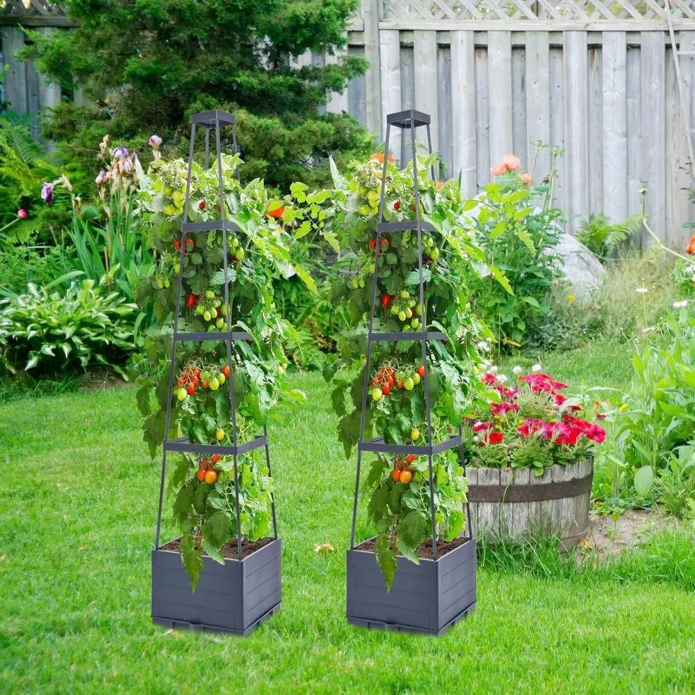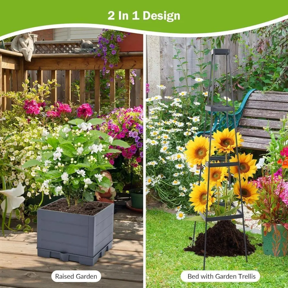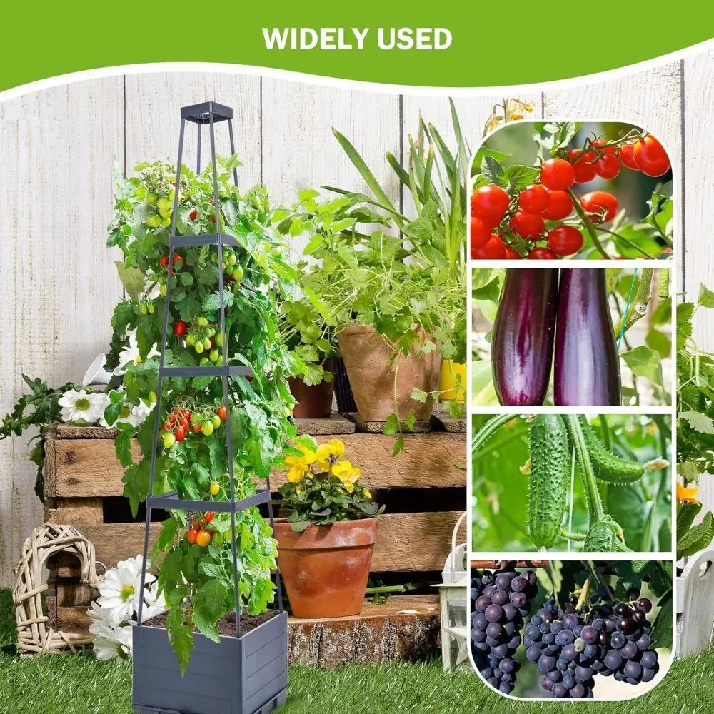 【Raised Garden Bed with Trellis】: This space-saving solution thoughtfully combines a tomato planter with a trellis, supporting vertical plant growth and maximizing your green space. Our planter box boasts a unique 4 corner tower design. This innovative design maximizes vertical space, allowing your plants to grow taller and spread out, making the most of your gardening space