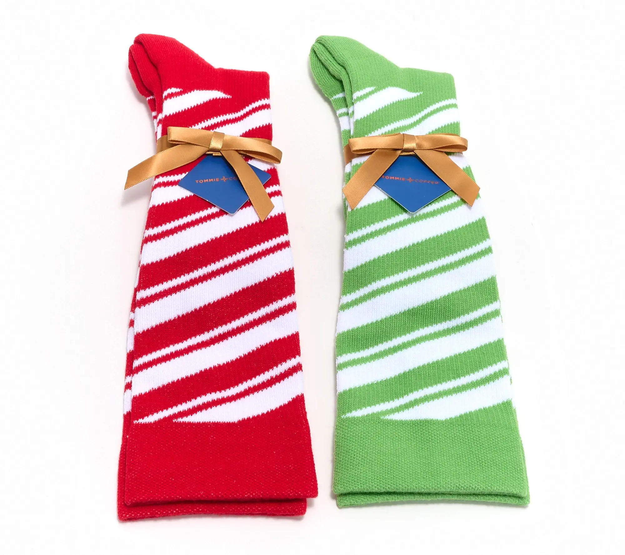 Festive style meets graduated compression support with this set of two Tommie Copper over-the-calf socks, designed to help provide temporary relief from aches, pains, and muscle soreness as you tackle holiday errands, fit in a workout, or relax at home. Fun seasonal patterns and a ribbon presentation make these socks as great for gifting as they are for everyday wear. From Tommie Copper.