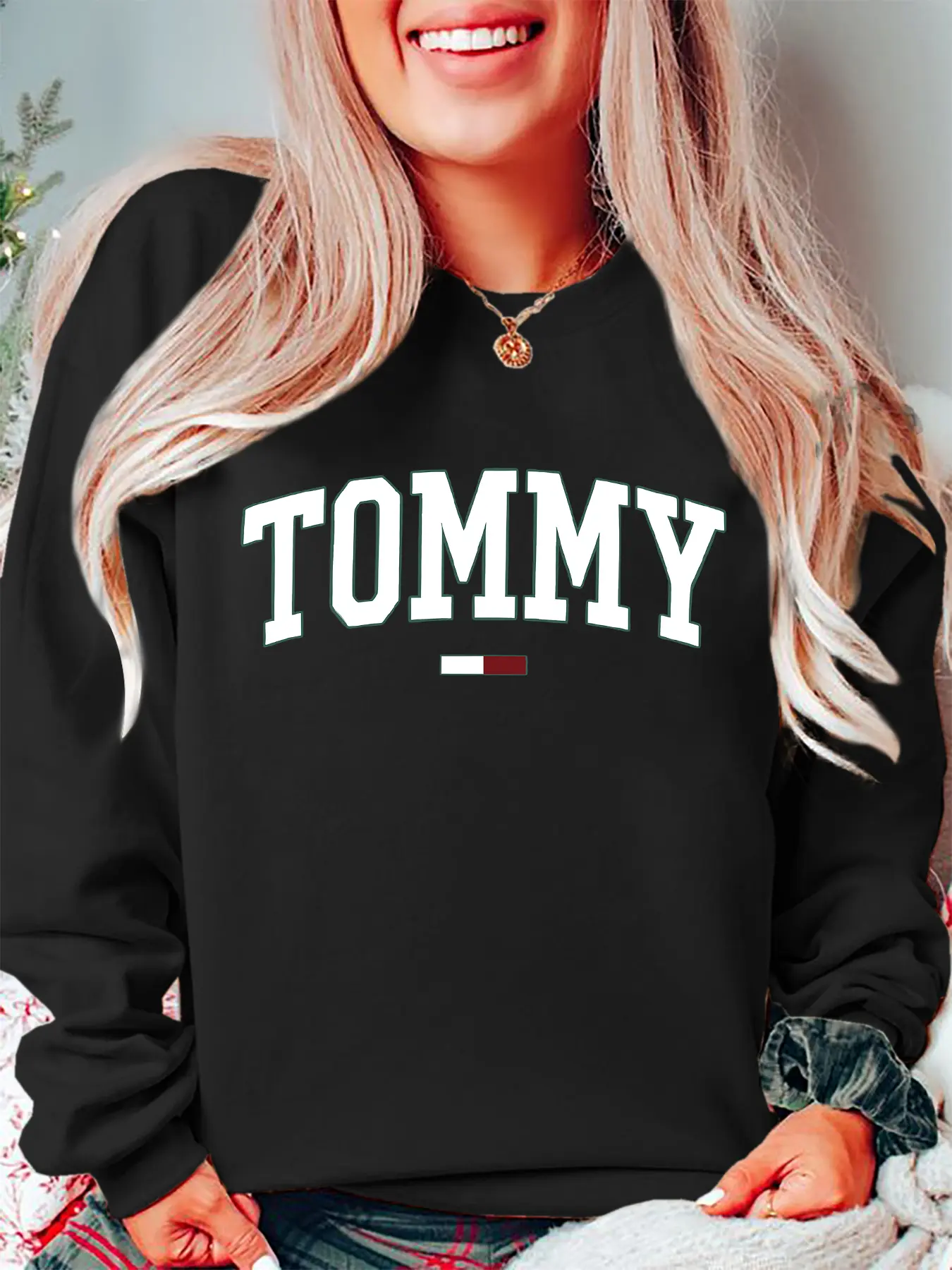 Tommy Pattern Print Long Sleeve Casual Loose Fit Pullover Sweater for Women, Fall & Winter Round Neck Fitted Style