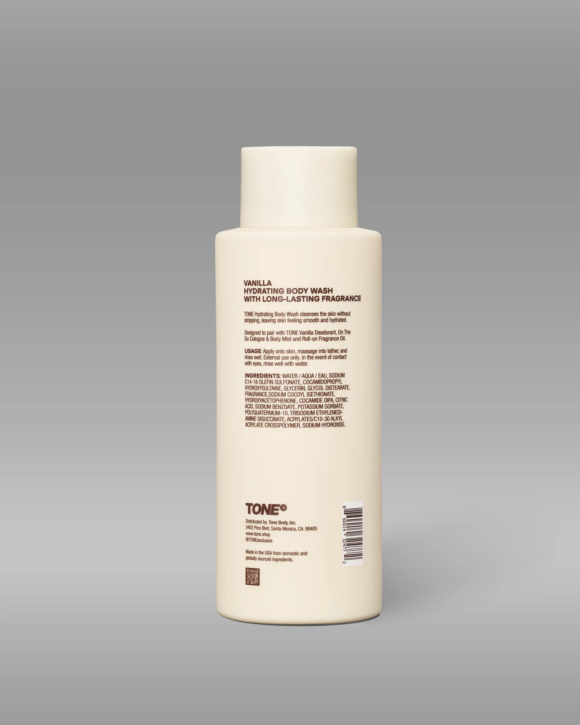 TONE Vanilla Hydrating Body Wash for Men is designed to cleanse effectively while delivering long-lasting fragrance with a warm Vanilla Smoke scent featuring smooth vanilla and a subtle smoky finish. Formulated with coconut-derived cleansers and glycerin, it removes dirt and buildup while helping support smooth, comfortable skin. The Vanilla Smoke scent feels warm and modern without being overpowering. Designed for daily use, this body wash fits seamlessly into a simple, effective men’s grooming routine.
