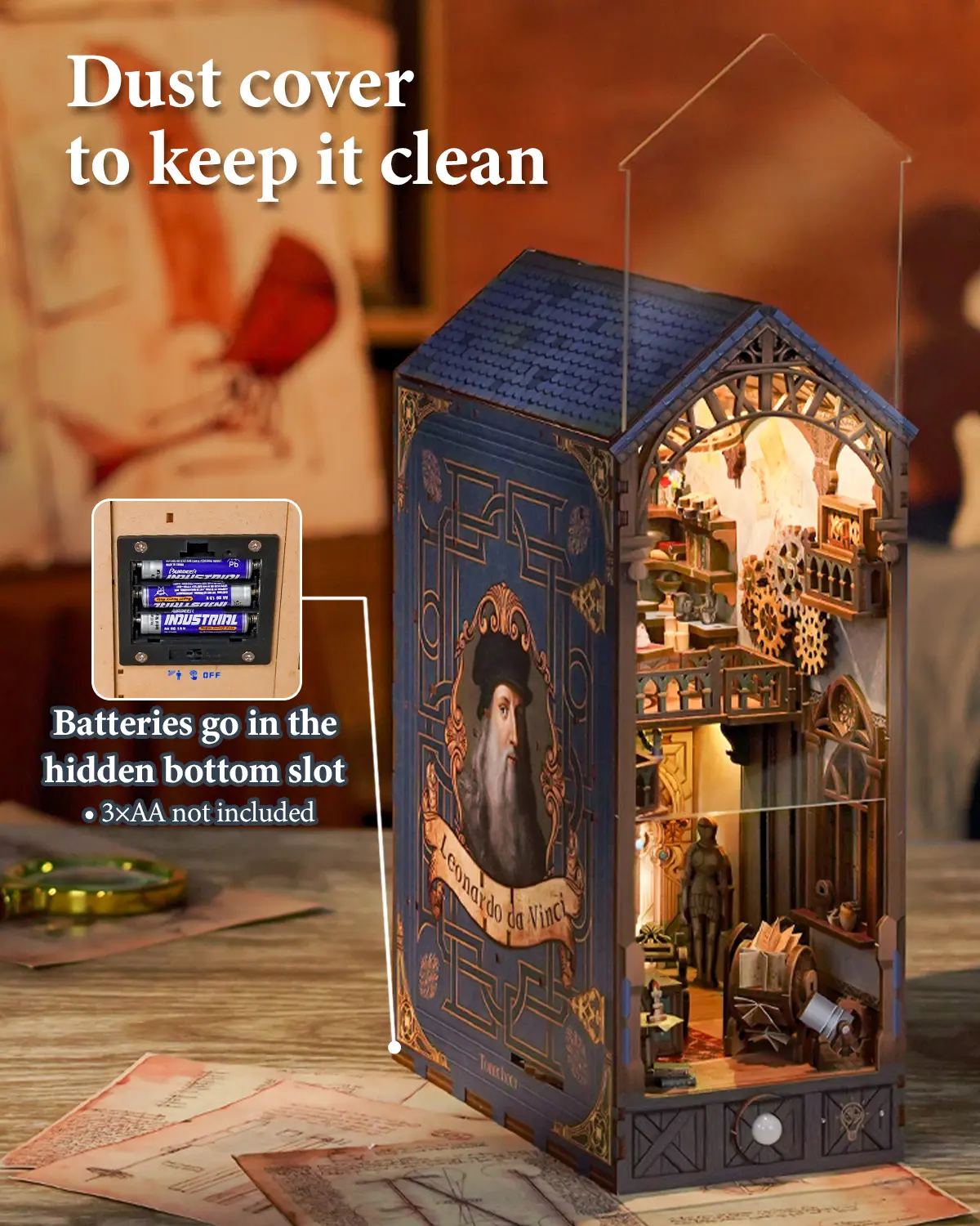 This Leonardo de vinchi Booknook has many gimmicks and cool aspects, from motion sensor to an infinite hallway! #diy #diyproject #diyjunkie #diykit #gift #giftideas #birthdaygift #birthdaygiftidea #activityideas #diygiftideas #funhobbies #hobbyideas #booknook #booknookdiy #leonardodevinchi
