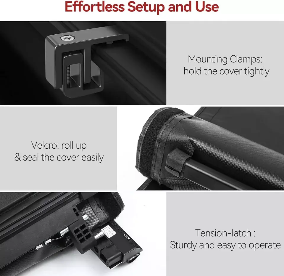 Innovative Design: Equipped with a Tension Latch System at the tail end, our roll-up tonneau cover offers convenient lock & unlock functionality; Enjoy all bed access whenever you need it, without any hassle