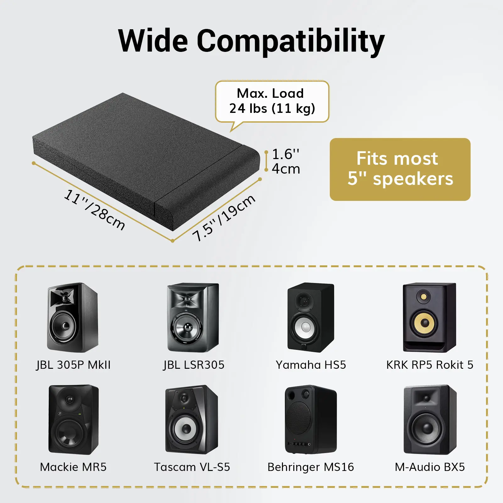 ·Dimensions & Weight Capacity: The dimensions of this monitor isolation pad are 7.5''W x 11''D x 1.6''H (19cm x 27.5cm x 3.8cm). It can withstand a maximum weight of 24 lbs (11kg) without altering its shape.