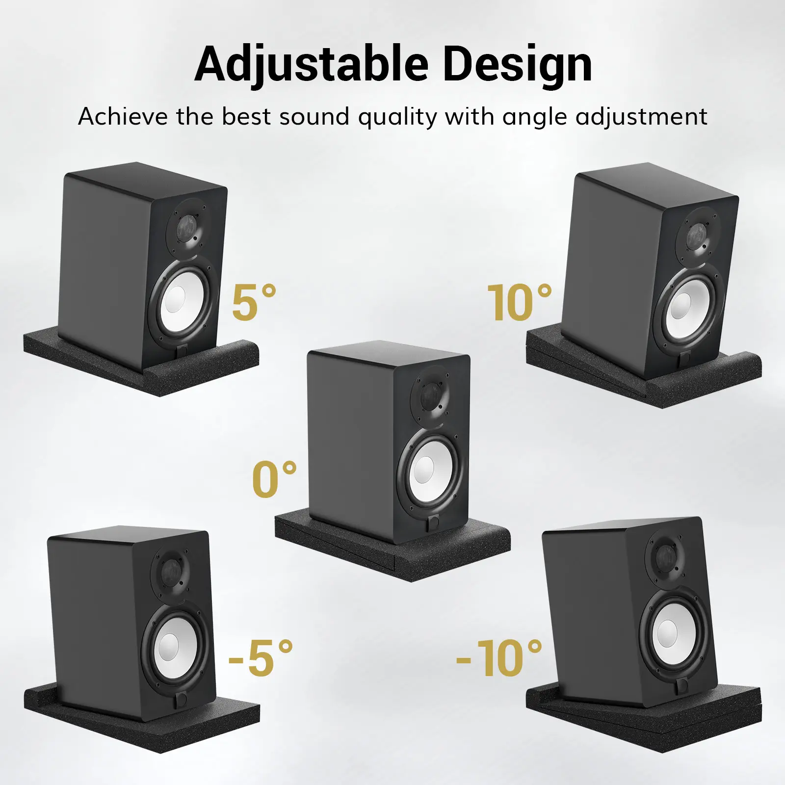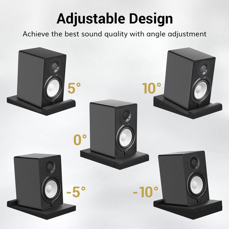 ·Adjustable Design: Each package comes with two isolation pads, one for each left and right speaker. In addition, there are two isolation pad accessories for angle adjustment, providing five tilt adjustments: -10°, -5°, 0°, 5°, and 10°. You can adjust the monitor isolation pads to different angles for the best sound quality.