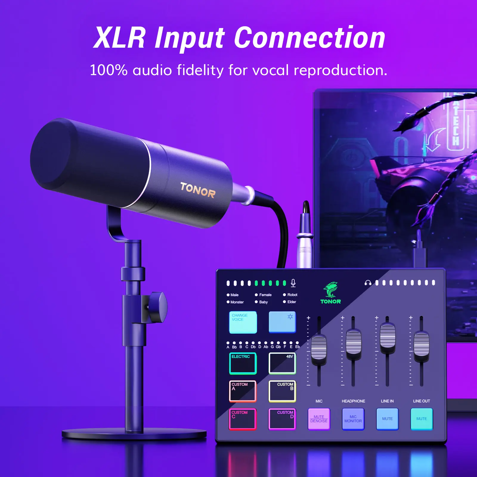 Ready to level up your gaming and streaming setup? The TONOR TX310 Gaming Audio Interface is your new best friend. Whether you're chatting with teammates or broadcasting live, this mixer delivers pro-level sound with its high-quality preamp and versatile 6.5mm and XLR inputs. It’s perfect for mics and instruments alike, making it a breeze to switch between gaming, music, or voice streaming. The 11 RGB lighting modes add a stylish glow that matches your vibe, while headphone monitoring lets you hear yourself clearly in real time. With easy plug-and-play compatibility for Mac, Windows, PS4, and PS5, plus included USB-C and audio cables, you’re all set to go. Inside the box, you get the TX310 mixer, a USB-C to USB-A cable, and a 3.5mm audio cable. Ready to sound like a pro? Grab the TX310 and start streaming with confidence and style!