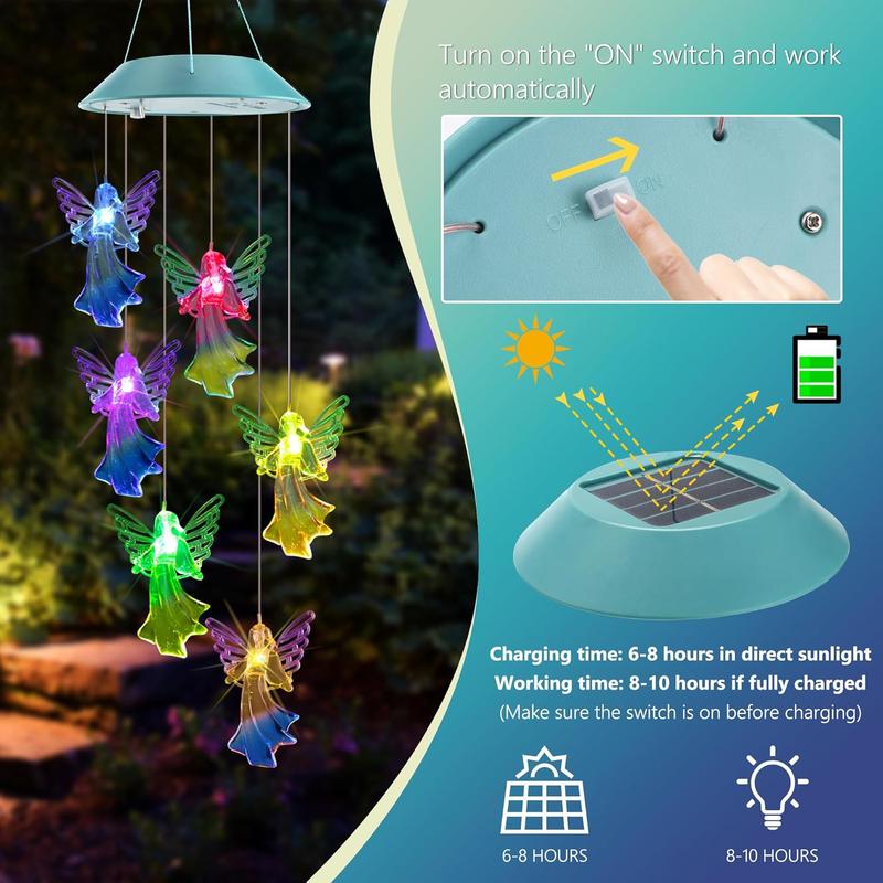 ·[Easy to Use and Economical]Come with swivel hook, easy to hang in garden tree, backyard, front porch, patio or anywhere you can, and set the switch to "ON".The solar angle chimes lights gather energy from the sun during the day, no need extra energy and eco-friendly.Just make sure the solar panel can get hours of sunlight to charge the built-in battery then you can enjoy your light show at night/dark.