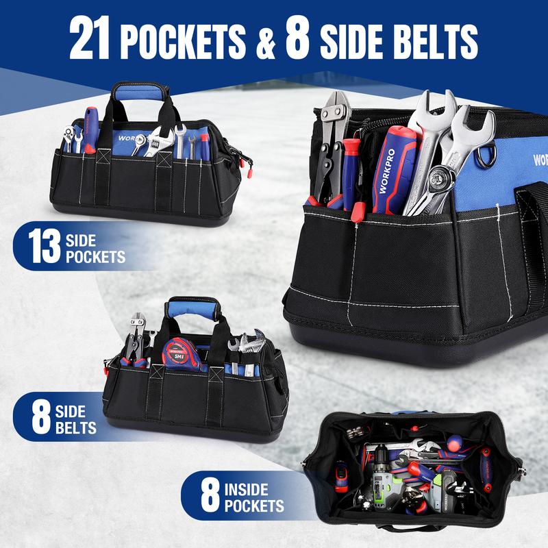 ·𝐌𝐮𝐥𝐭𝐢-𝐏𝐨𝐜𝐤𝐞𝐭𝐬 & 𝐋𝐚𝐫𝐠𝐞 𝐈𝐧𝐭𝐞𝐫𝐢𝐨𝐫 𝐒𝐩𝐚𝐜𝐞 - Our tool bag boasts 8 sturdy pockets inside, 13 exterior pockets and 8 belts for versatile storage of wrenches, pliers, screwdrivers and accessories. It will keep your gear organized and secure, no more digging through the bag to find that one plier. The bag is designed with large interior space which affords you retrieval of any tool. Size:16” x 9” x 10”