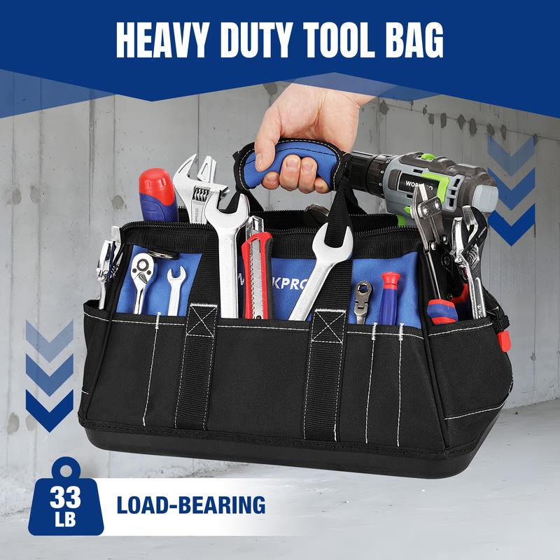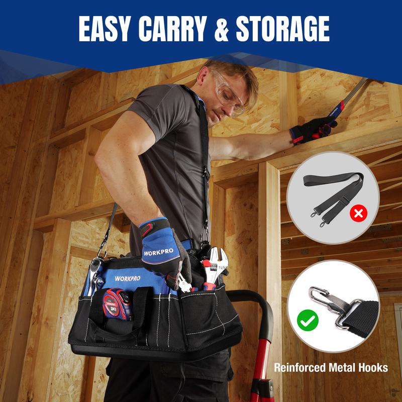 ·𝐖𝐢𝐝𝐞 𝐎𝐩𝐞𝐧 𝐌𝐨𝐮𝐭𝐡 & 𝐃𝐨𝐮𝐛𝐥𝐞-𝐏𝐮𝐥𝐥 𝐙𝐢𝐩𝐩𝐞𝐫 - This tool bag features wide open mouth with an internal metal frame and top double-pull zipper for easy organization and access. Just pull the zipper to open this bag smoothly and put in or take out your tools quickly when needed