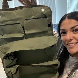 So many pockets and some are removable!! It’s waterproof and you can even hand carry it or sling carry. Comes in black and green, I went with green!
