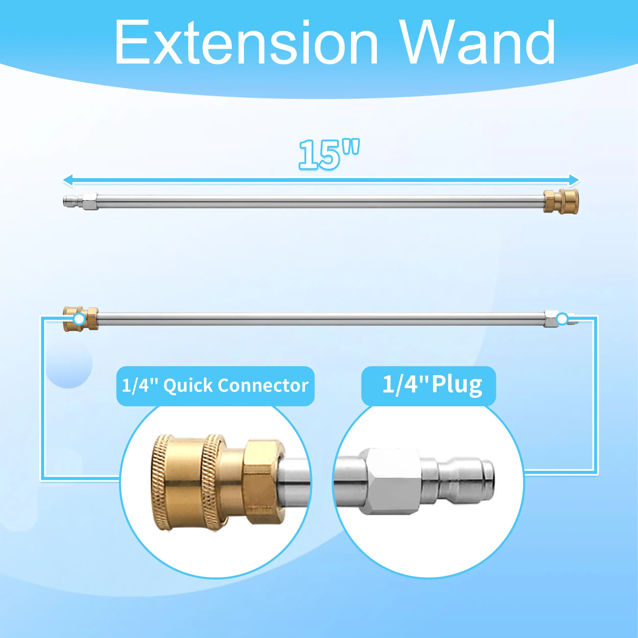 PRESSURE WASHER WAND EXTENSIONS: Each wand is 15 inches long, offering additional reach and flexibility for your pressure washing jobs. Equipped with a 1/4-inch quick connect fitting at the end, these wands seamlessly attach to various pressure washer accessories featuring a 1/4-inch QC connection.