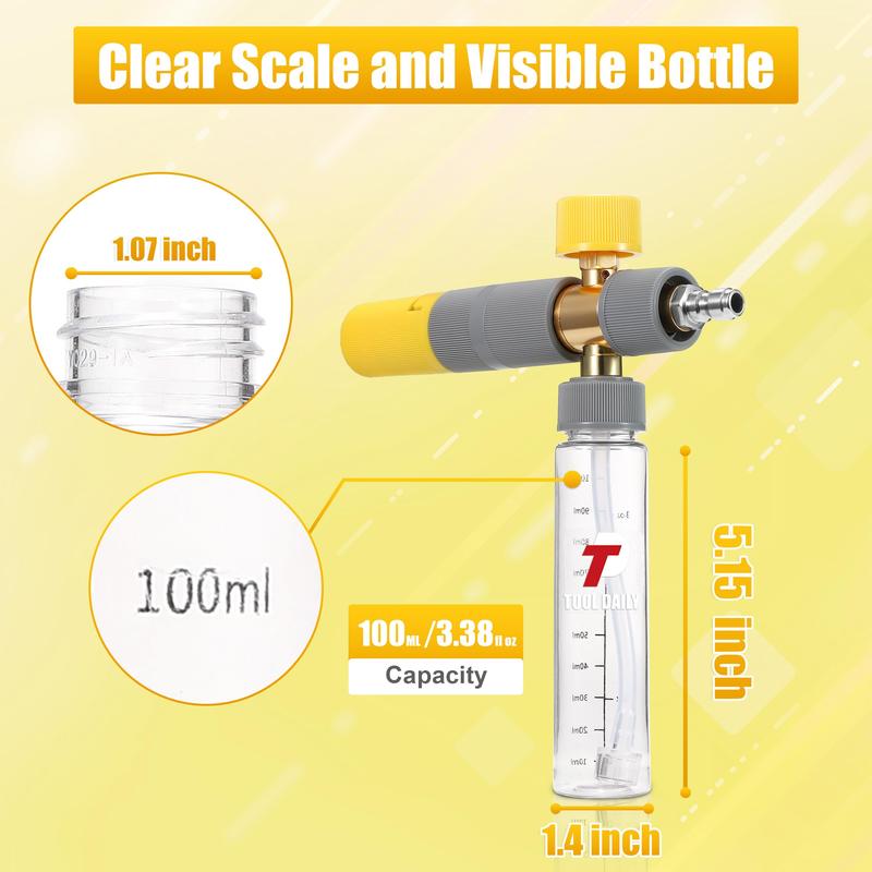 With a 100 ml/3.38 fl oz bottle capacity, this foam cannon is easy to carry. All parts are detachable for thorough cleaning and maintenance. It operates at a max working pressure of 3600 PSI. Portable and user-friendly for various cleaning tasks.