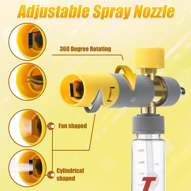 The foam cannon features a fully adjustable nozzle. Customize the spray pattern and direction. Use the top knob to adjust foam level. Turn clockwise for more foam and less water, or counterclockwise for the opposite effect. Perfect for versatile cleaning needs.