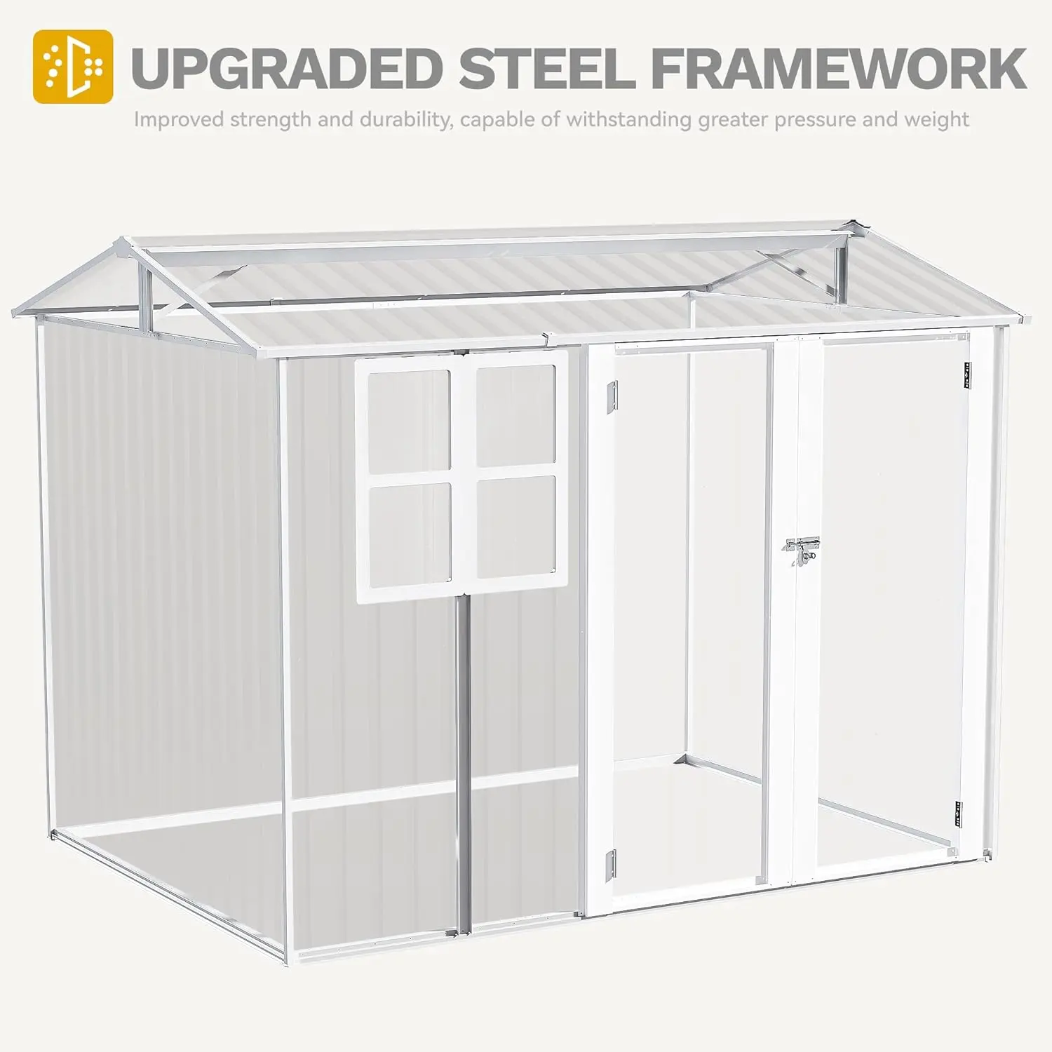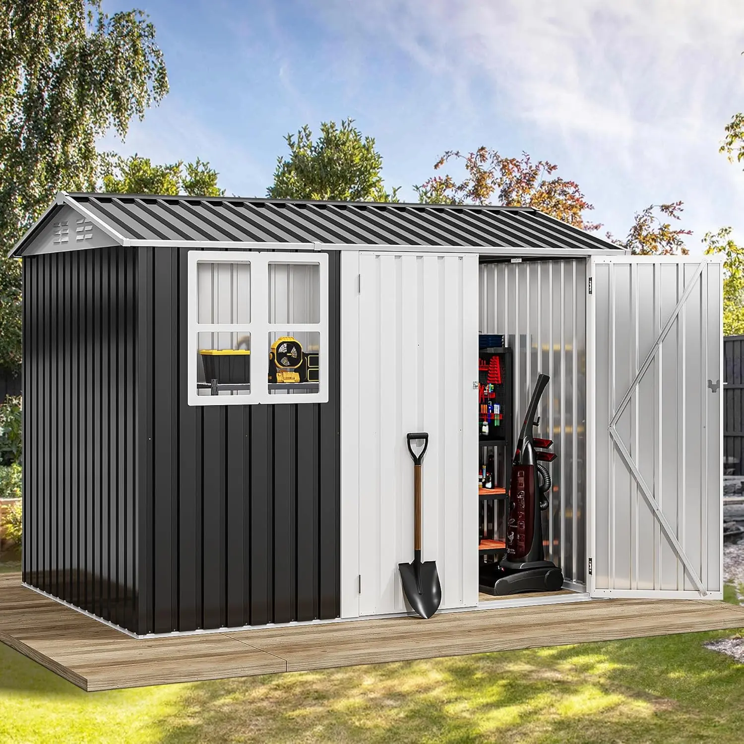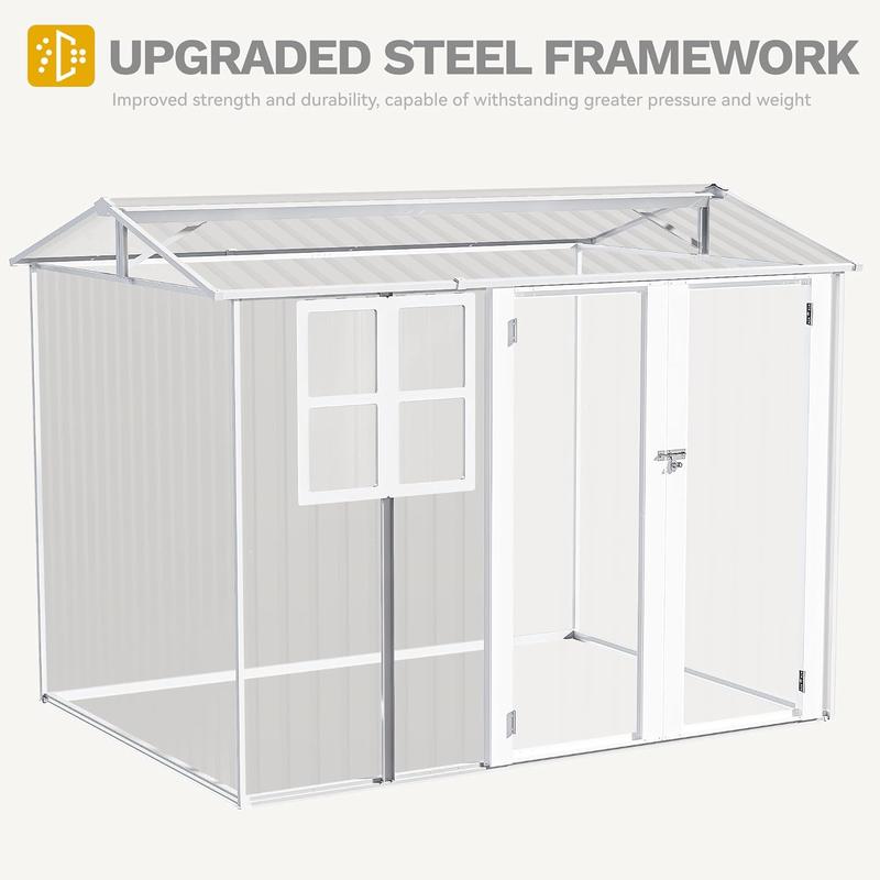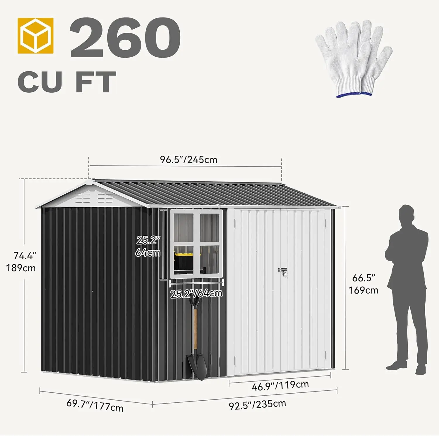 Spacious and Versatile: Measuring 92.5''L x 69.7''W x 74.4''H, this 8 x 6 ft metal outdoor storage shed offers 260 cubic feet of storage, spacious for garden tools, bikes, and outdoor gear; It's multipurpose as a pet shelter or greenhouse